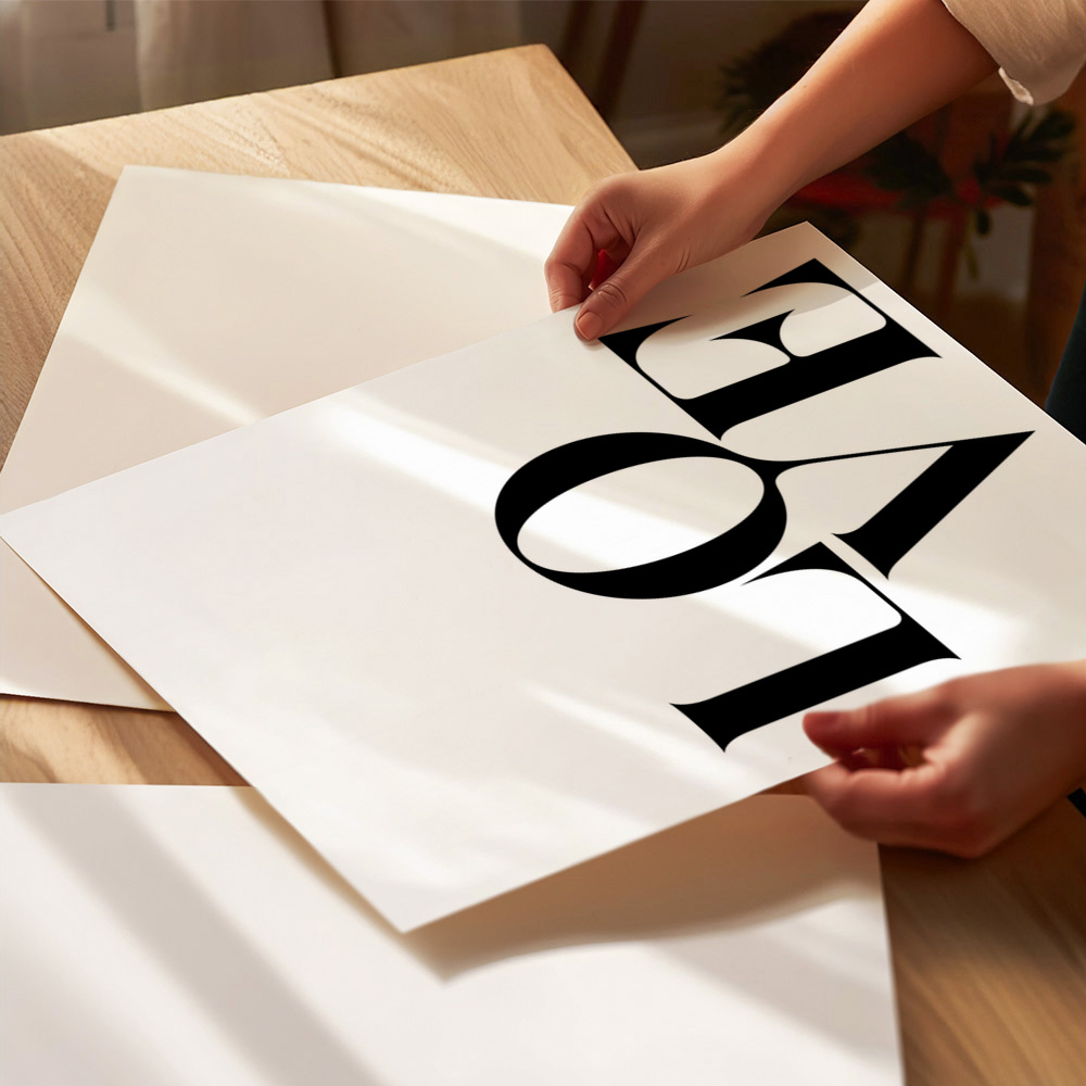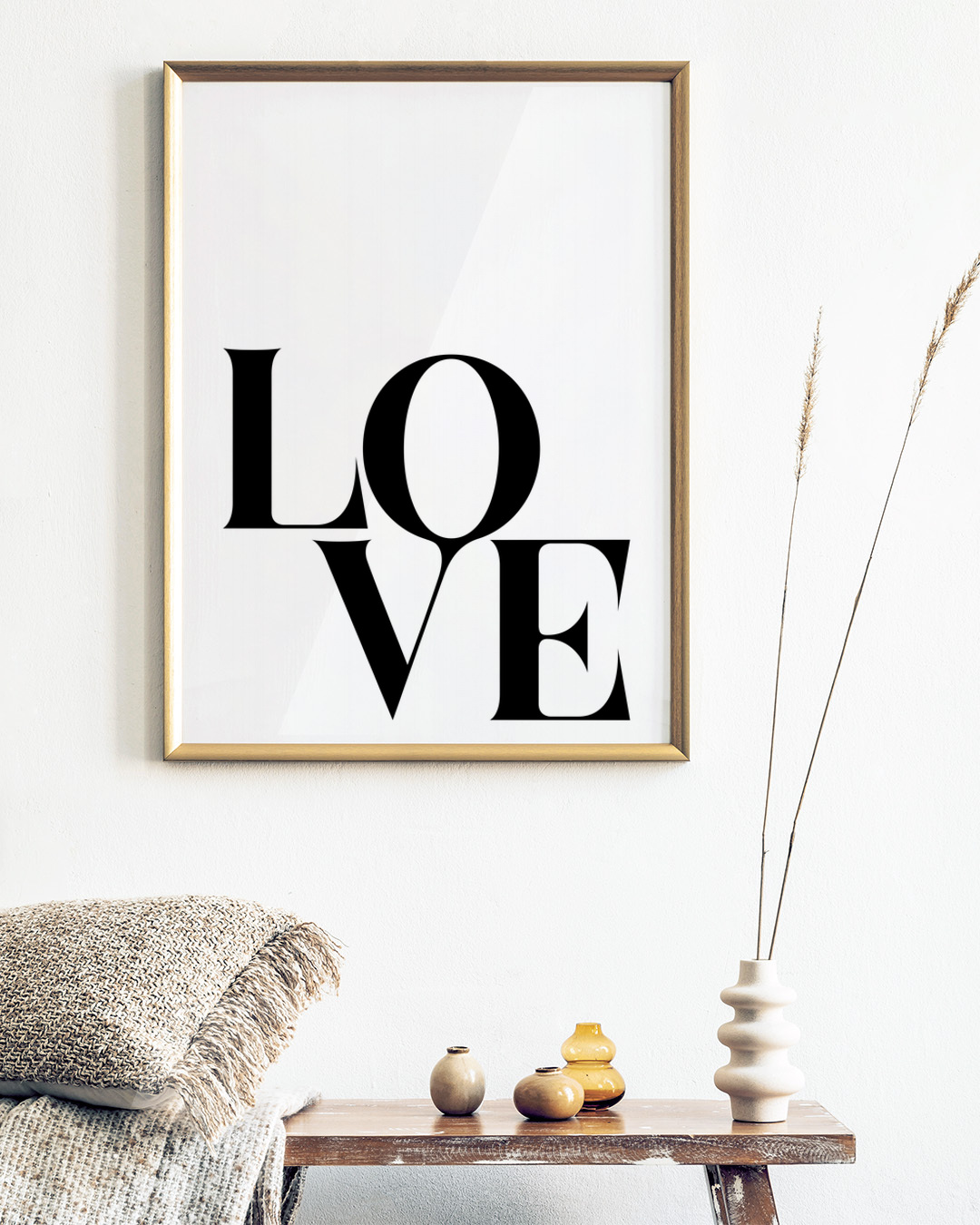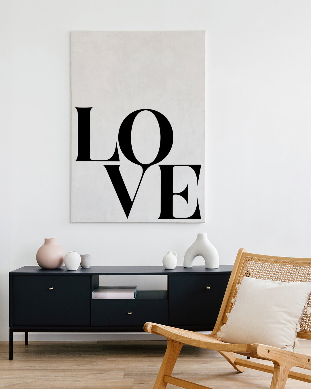 Minimalistisches 'love'-Textdesign in fetter schwarzer Schrift auf weißem Hintergrund. Dieses schwarz-weiße Kunstwerk verleiht jedem Raum einen Hauch von moderner Eleganz.