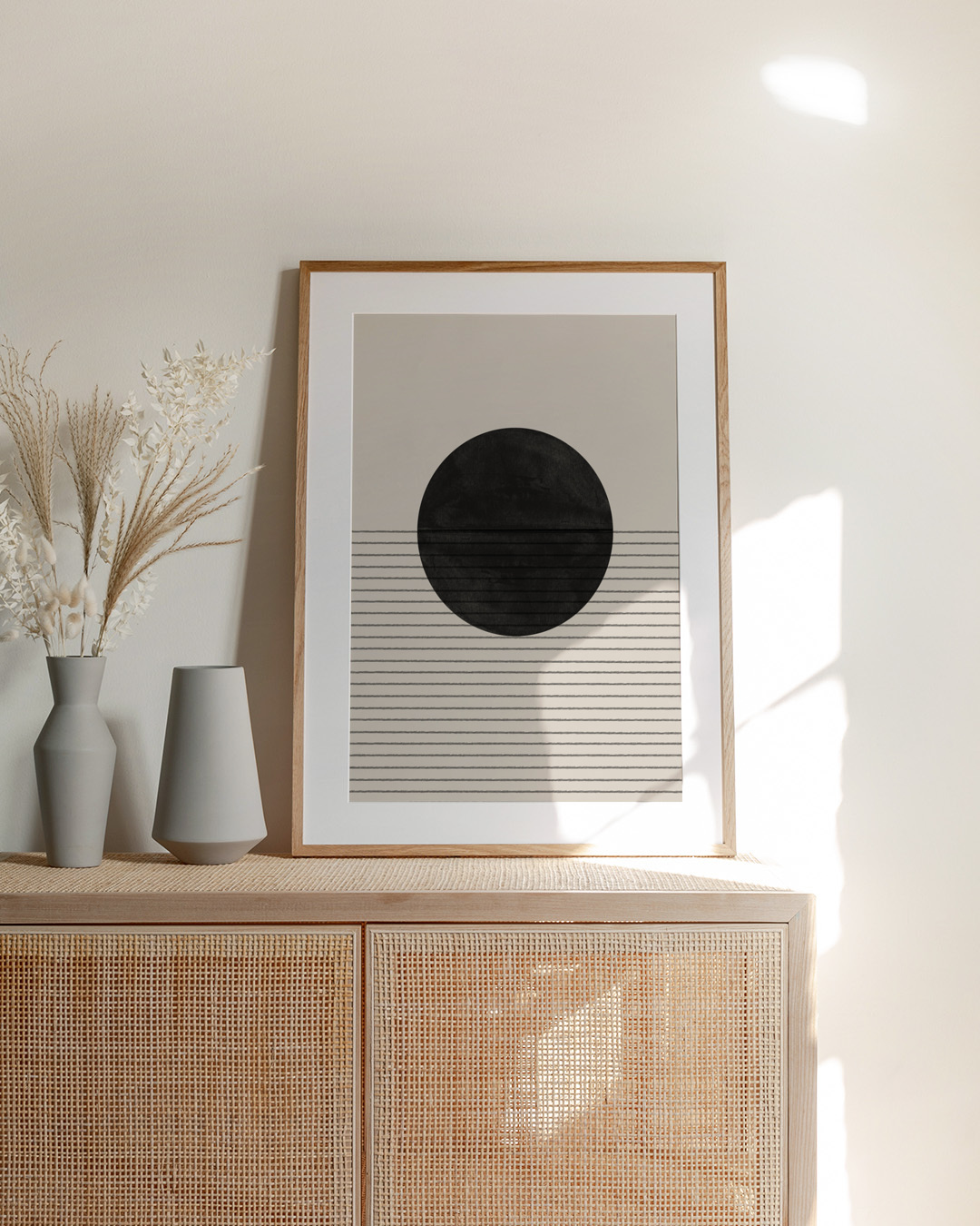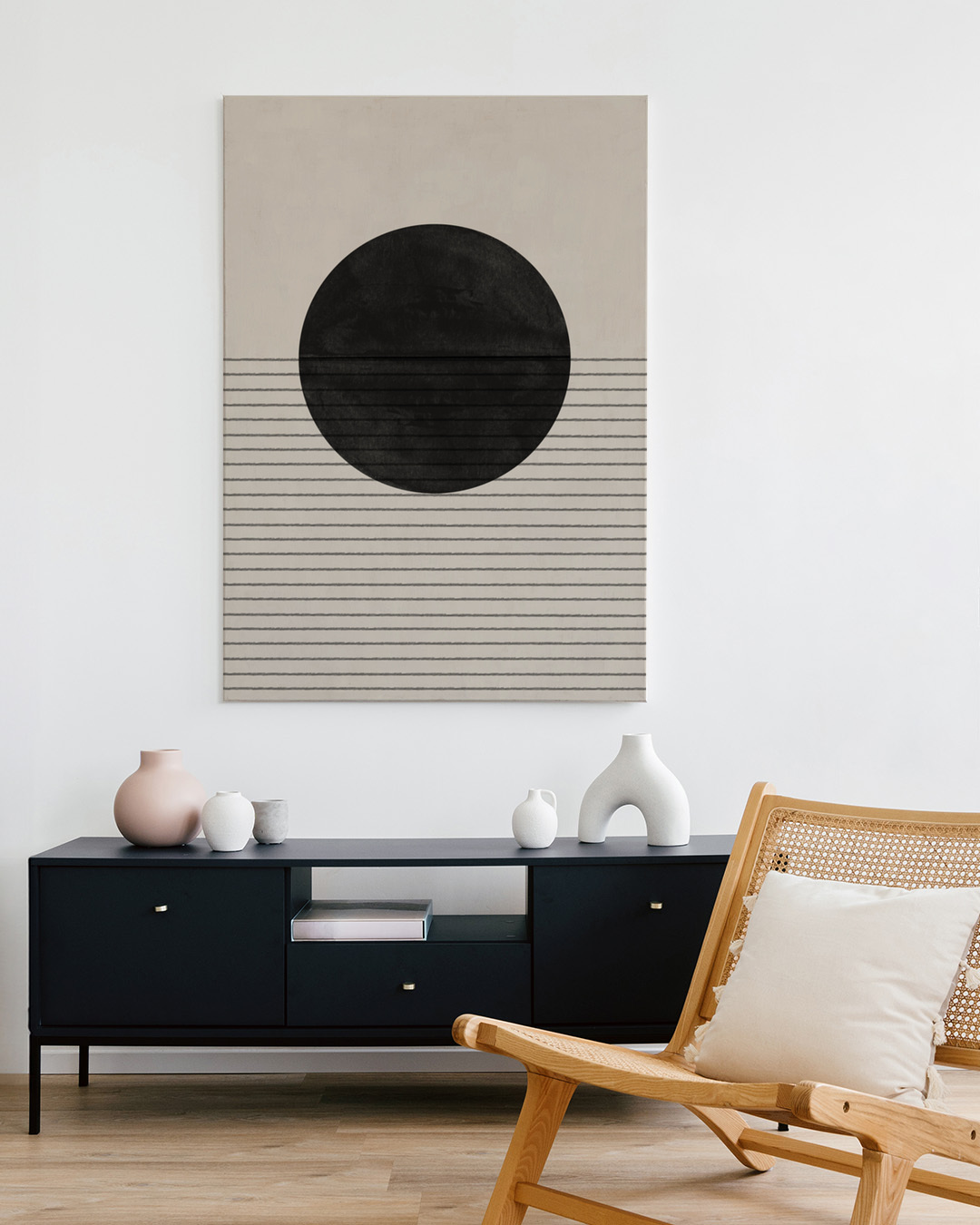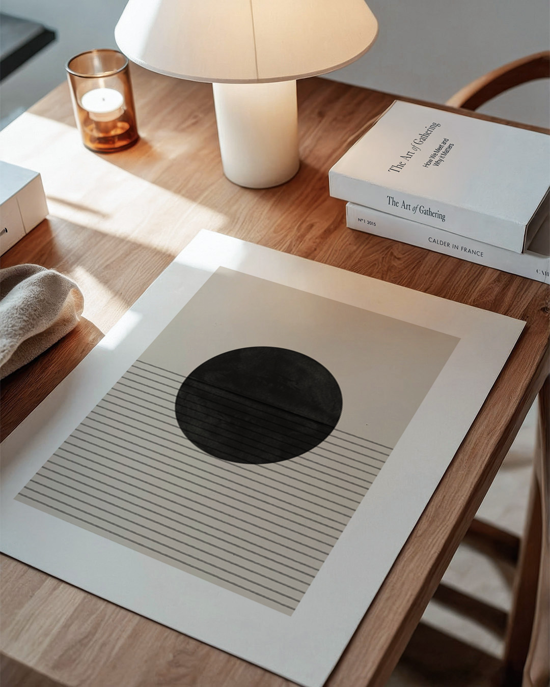Entdecken Sie dieses minimalistische Design von Miuus Studio mit einem kräftigen schwarzen Kreis vor einem Hintergrund aus horizontalen Streifen in neutralen Tönen. Die einfache, aber auffällige Komposition verleiht moderne Eleganz.