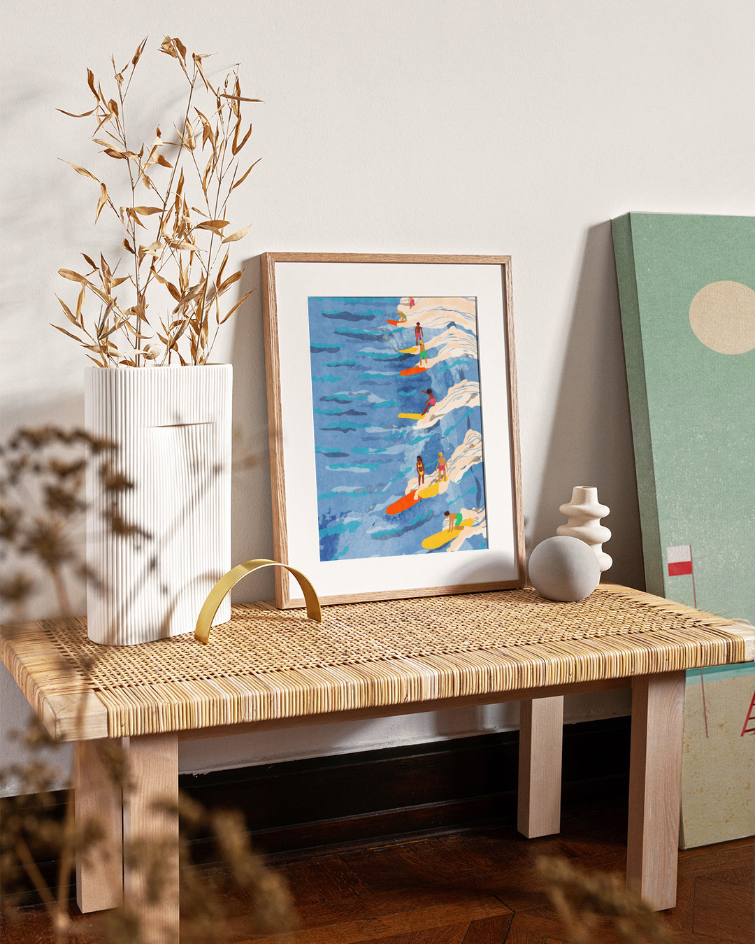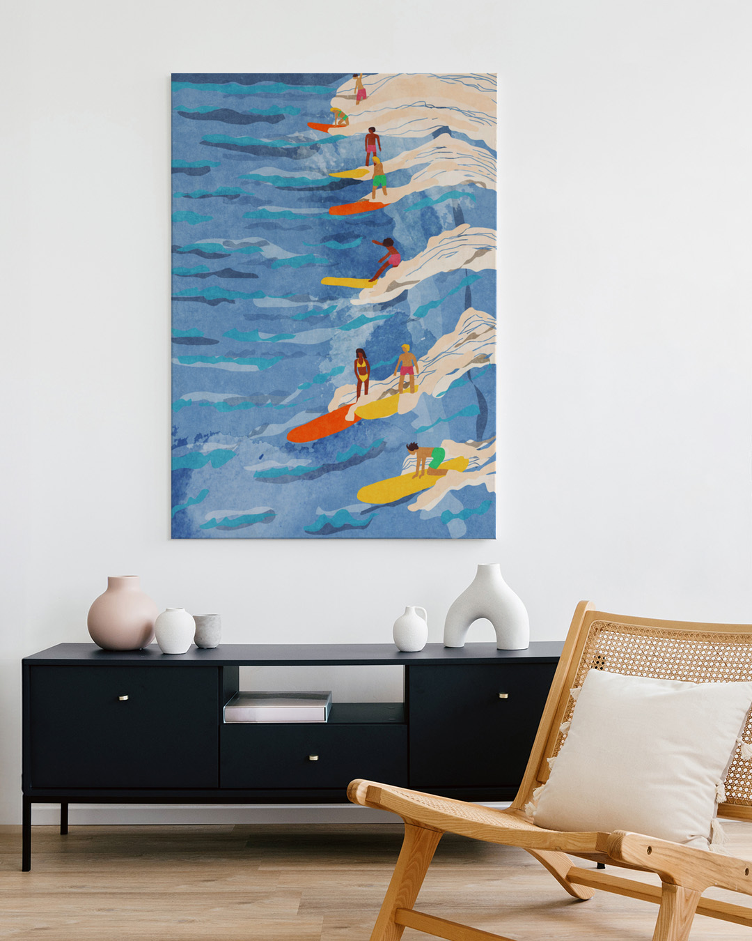Eine lebendige Illustration von Raissa Oltmanns, die Surfer auf farbenfrohen Wellen zeigt und die landschaftliche Schönheit und den Nervenkitzel des Sports einfängt.