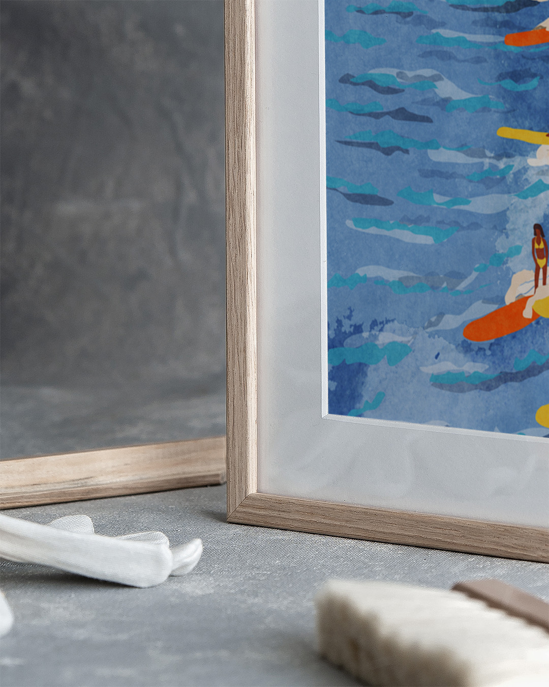 Die gespannte Leinwand wird in einen stilvollen Schattenfugenrahmen aus echtem Holz eingefasst, um einen eleganten Look und zusätzliche Dimension zu schaffen. Der Raum zwischen der Leinwand und dem Rahmen erzeugt einen schwebenden Effekt.