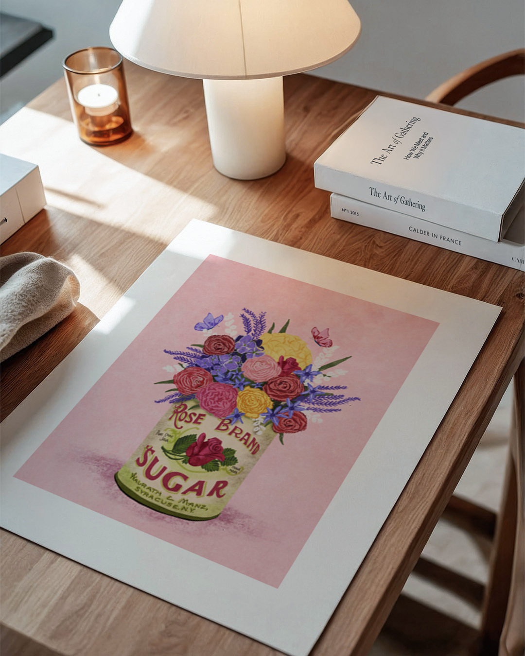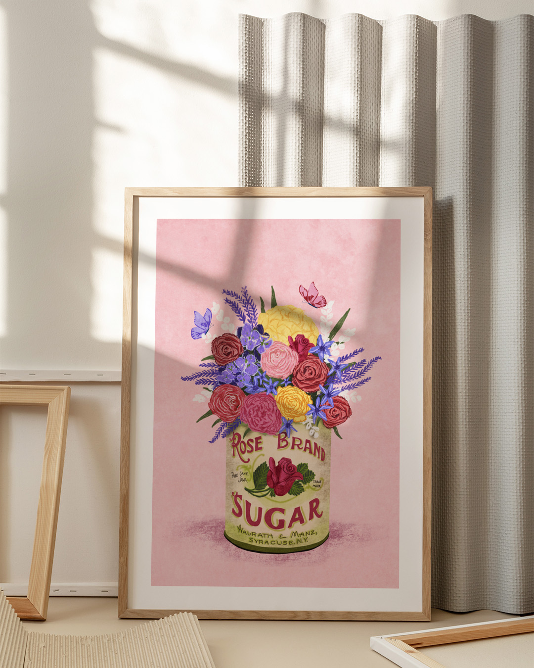 Eine charmante Vintage-Dose gefüllt mit verschiedenen bunten Blumen und detaillierten Illustrationen mit lebendigen Rosen, Hortensien und mehr.