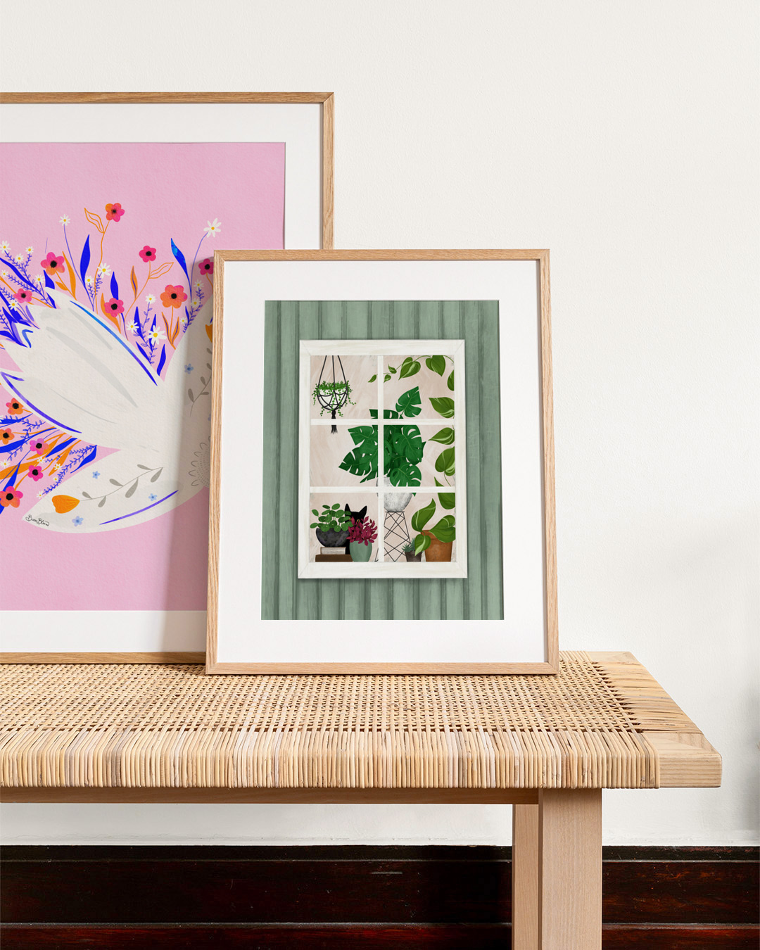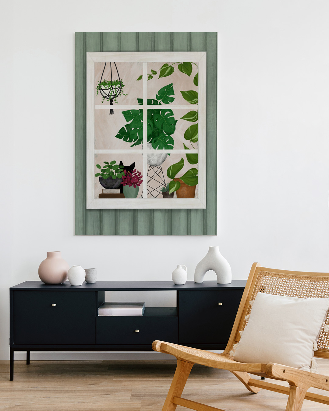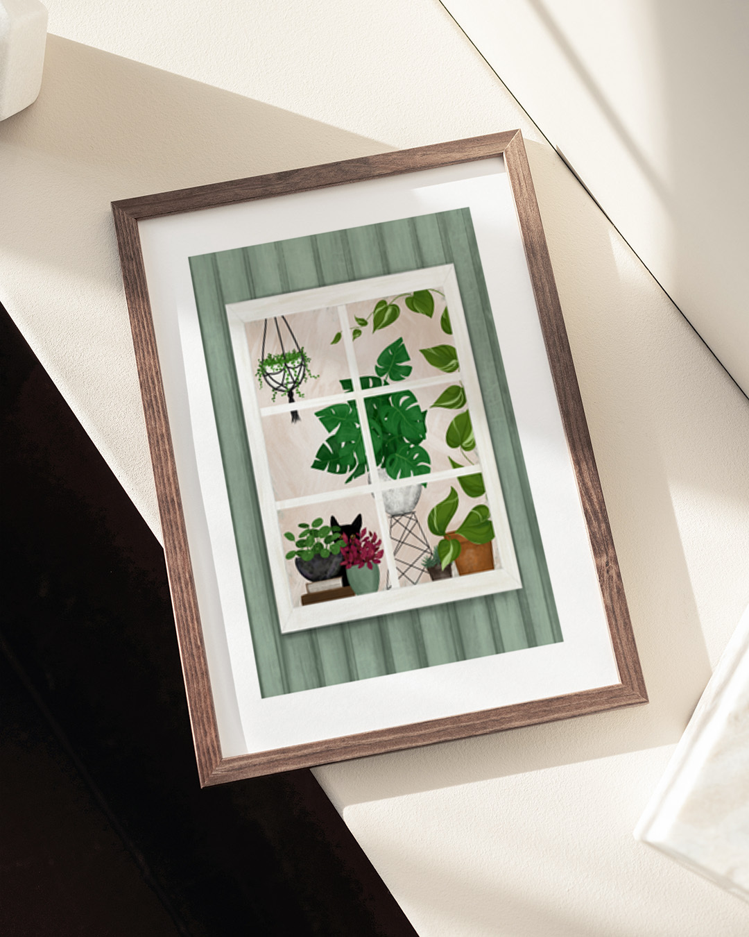 Eine reizvolle Illustration von Emelie Bylund, die verschiedene Zimmerpflanzen zeigt, die durch ein gemütliches Fenster zu sehen sind. Eine Katze schaut dezent hinter dem Laub hervor und verleiht dem botanisch inspirierten Kunstwerk eine charmante Note.