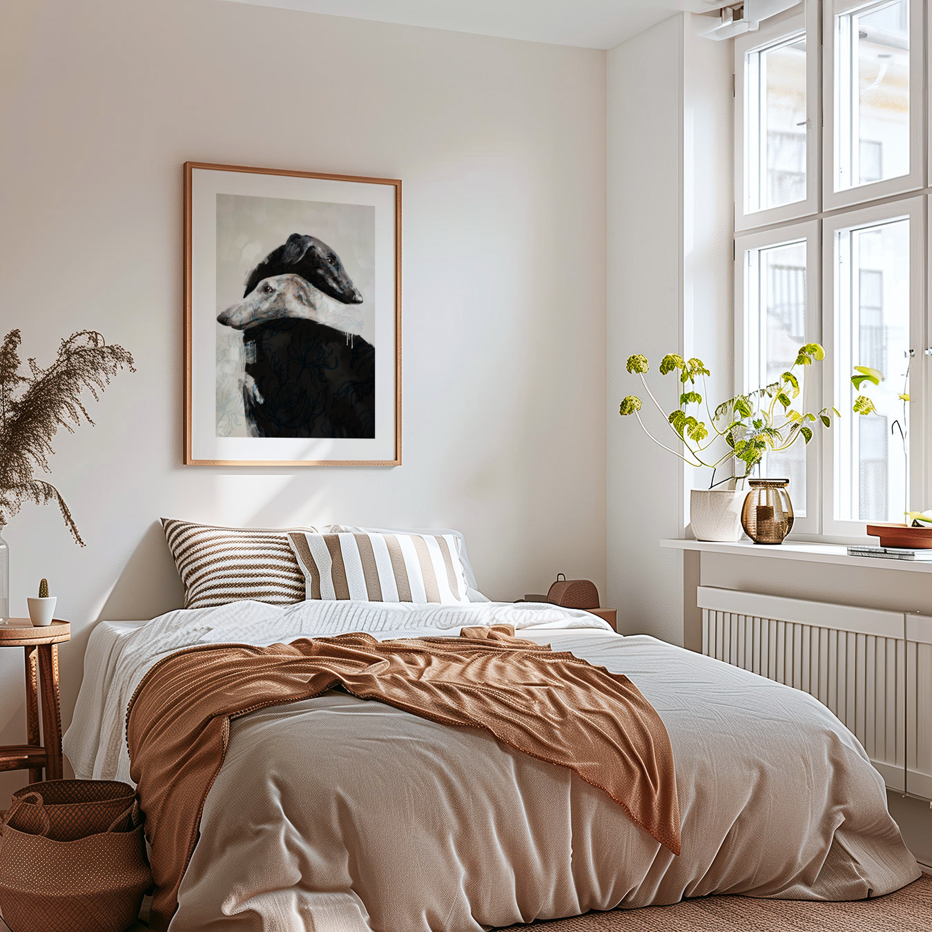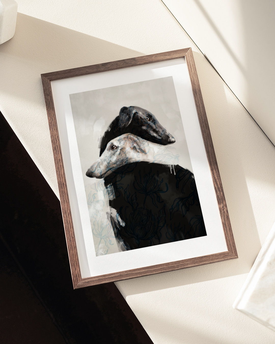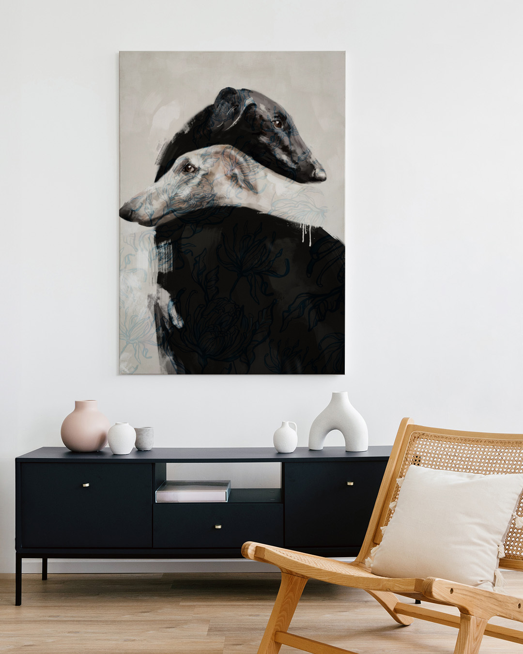 Das Kunstwerk von Gabriella Roberg zeigt zwei elegante Windhunde mit verschlungenen Formen vor einem zarten Blumenmuster. Die Komposition, reich an Texturen und subtilen Tönen, fängt einen harmonischen Moment von Gelassenheit und Kameradschaft ein.