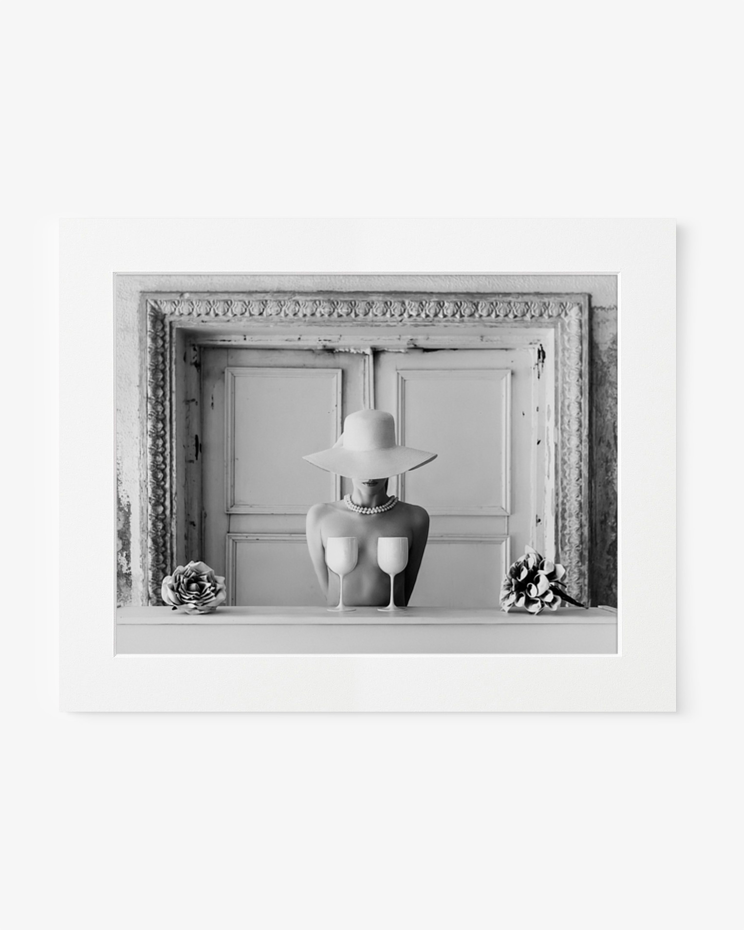 Dieses fesselnde Schwarz-Weiß-Foto zeigt eine elegante Frau mit breitkrempigem Hut und Perlen, die hinter zwei Weingläsern posiert und ein Gefühl von raffinierter Mystik vermittelt.