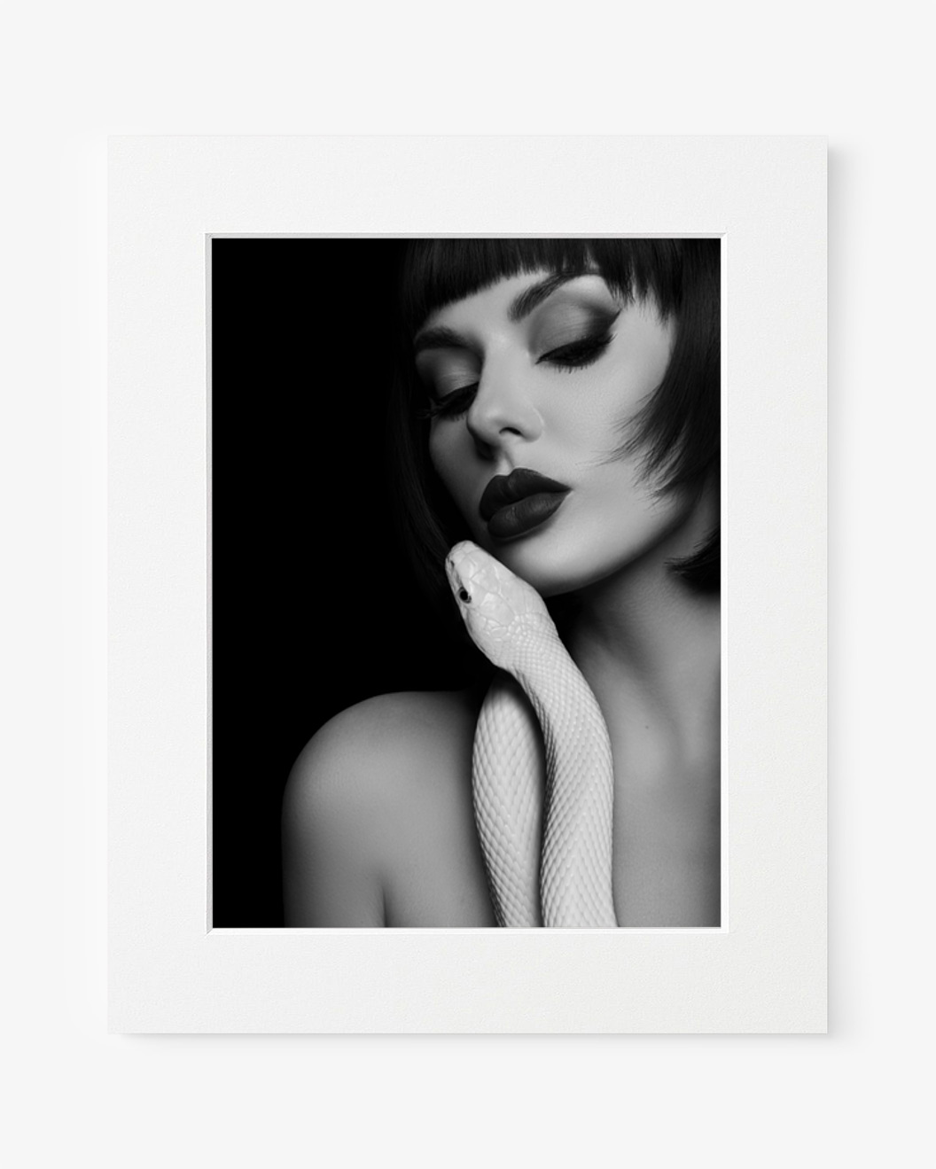 Ein faszinierendes schwarz-weiß Foto, das die intime Umarmung einer Frau und einer weißen Schlange zeigt. Der auffällige Kontrast und die sinnliche Komposition ziehen den Betrachter in diesen verbotenen Moment.