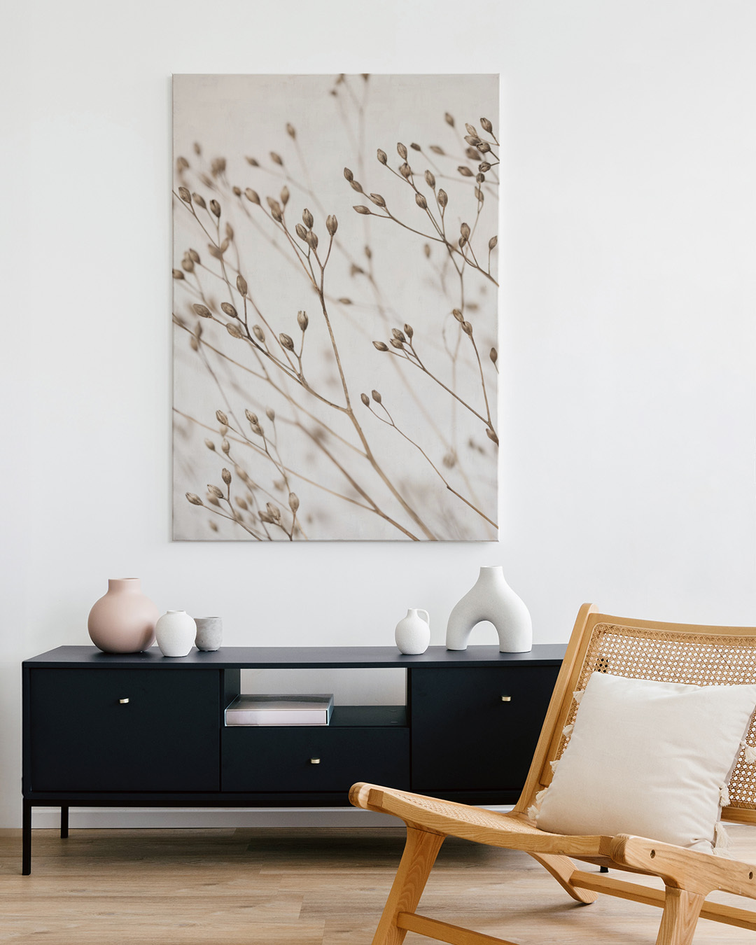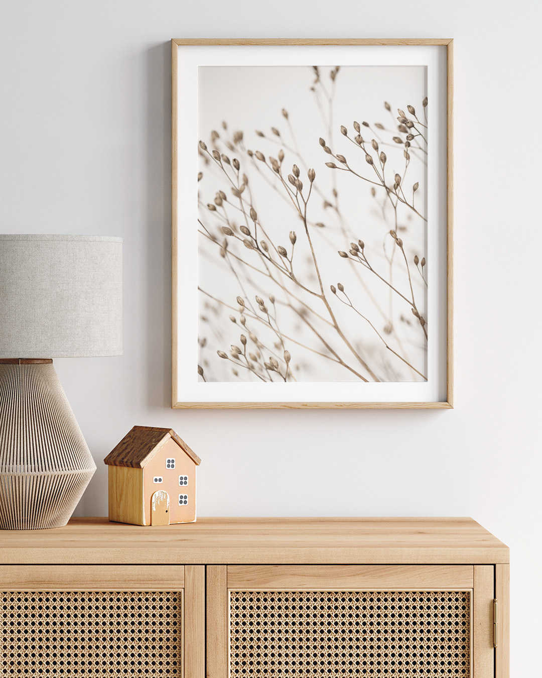 Dette elegante foto af Kathrin Pienaar fanger den skønhed af tørrede frø i naturlige toner. Billedet viser den delikate struktur og jordfarver, hvilket gør det til en beroligende tilføjelse til ethvert rum.