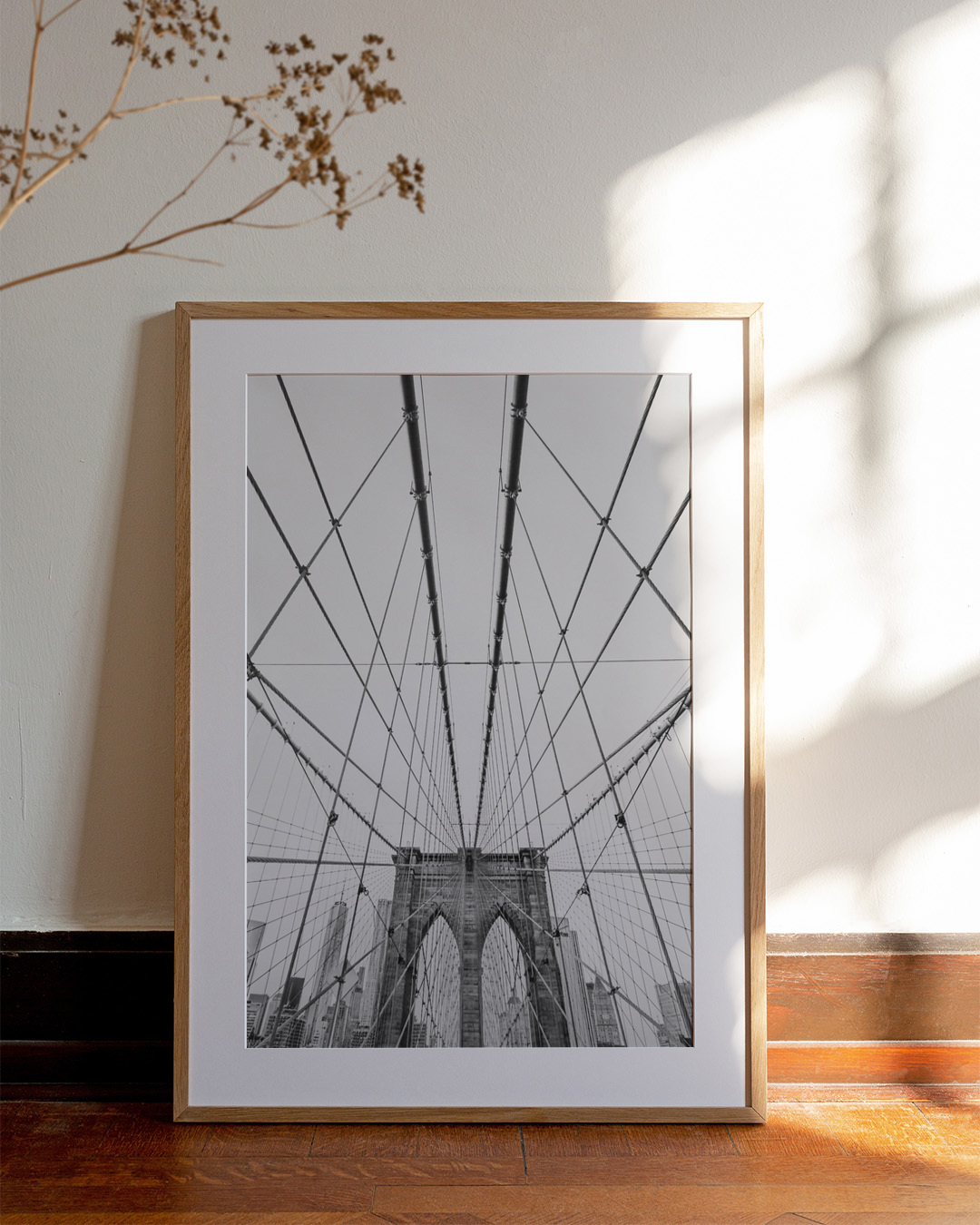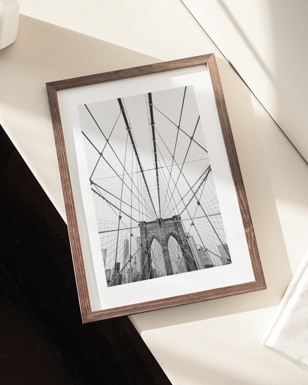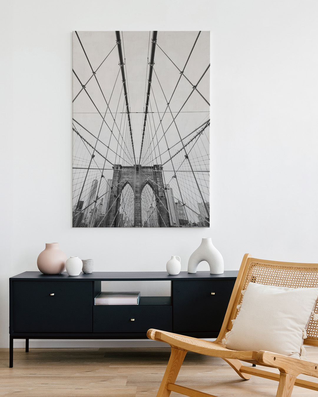 Oplev de arkitektoniske vidundere af Brooklyn Bridge i dette fængslende monokrome fotografi af Kathrin Pienaar. De indviklede linjer og tidløse design gør det til et must-have for elskere af bylandskaber.