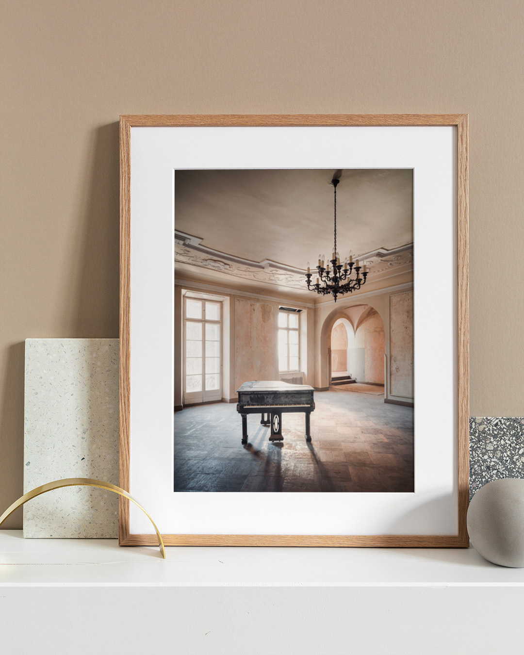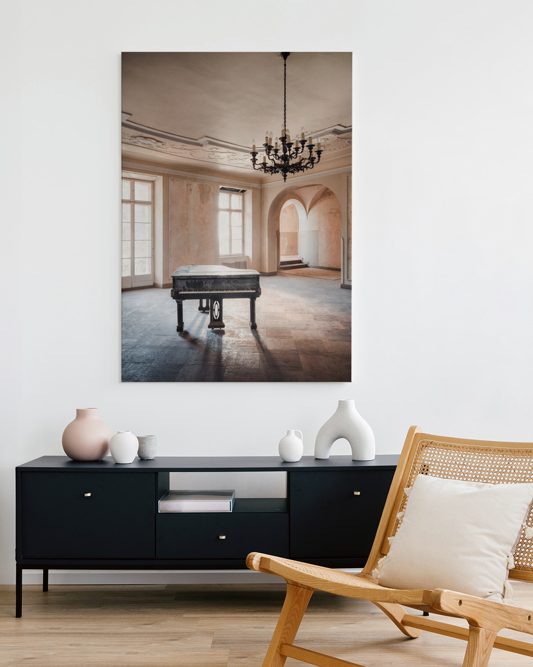 Dette fotografi fremkalder en følelse af nostalgi og viser et støvet klaver i et forladt slotsrum. Den vintage arkitektur med elegante lysekroner transporterer seeren til en svunden storhedstid.