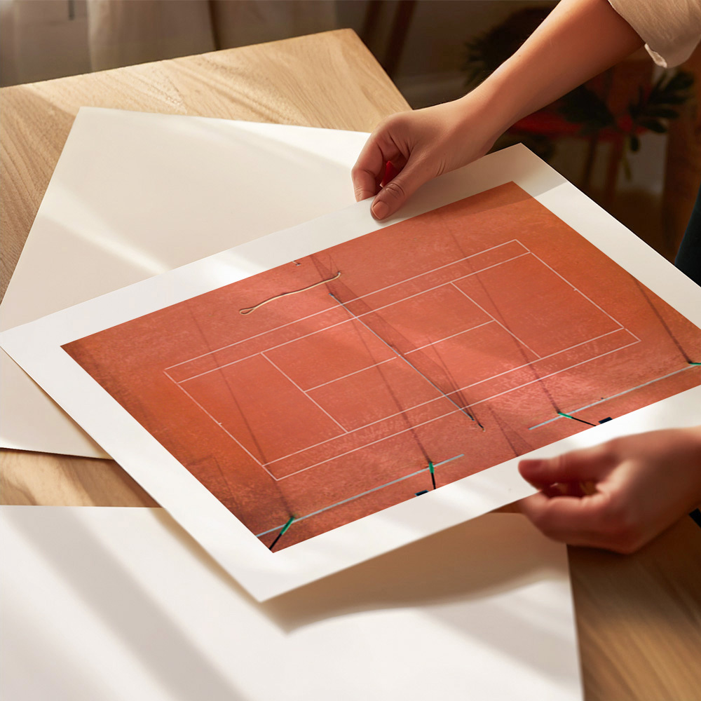 Et iøjnefaldende luftfoto af en rød ler tennisbane. Dette sportsrelaterede billede viser banens linjer og dens design detaljer, perfekt for tennisentusiaster og sportselskere.