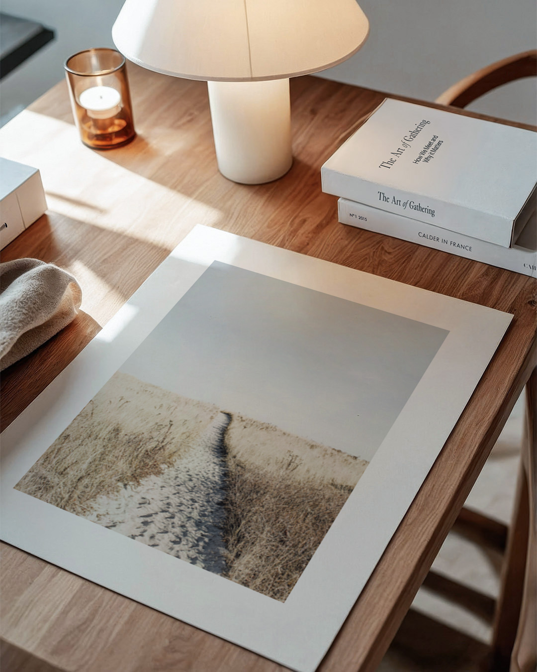 Et roligt fotografi af Kathrin Pienaar, der fanger en sandsti gennem højt græs som fører til en stille strand. De naturlige toner giver en fredelig kystflugt.