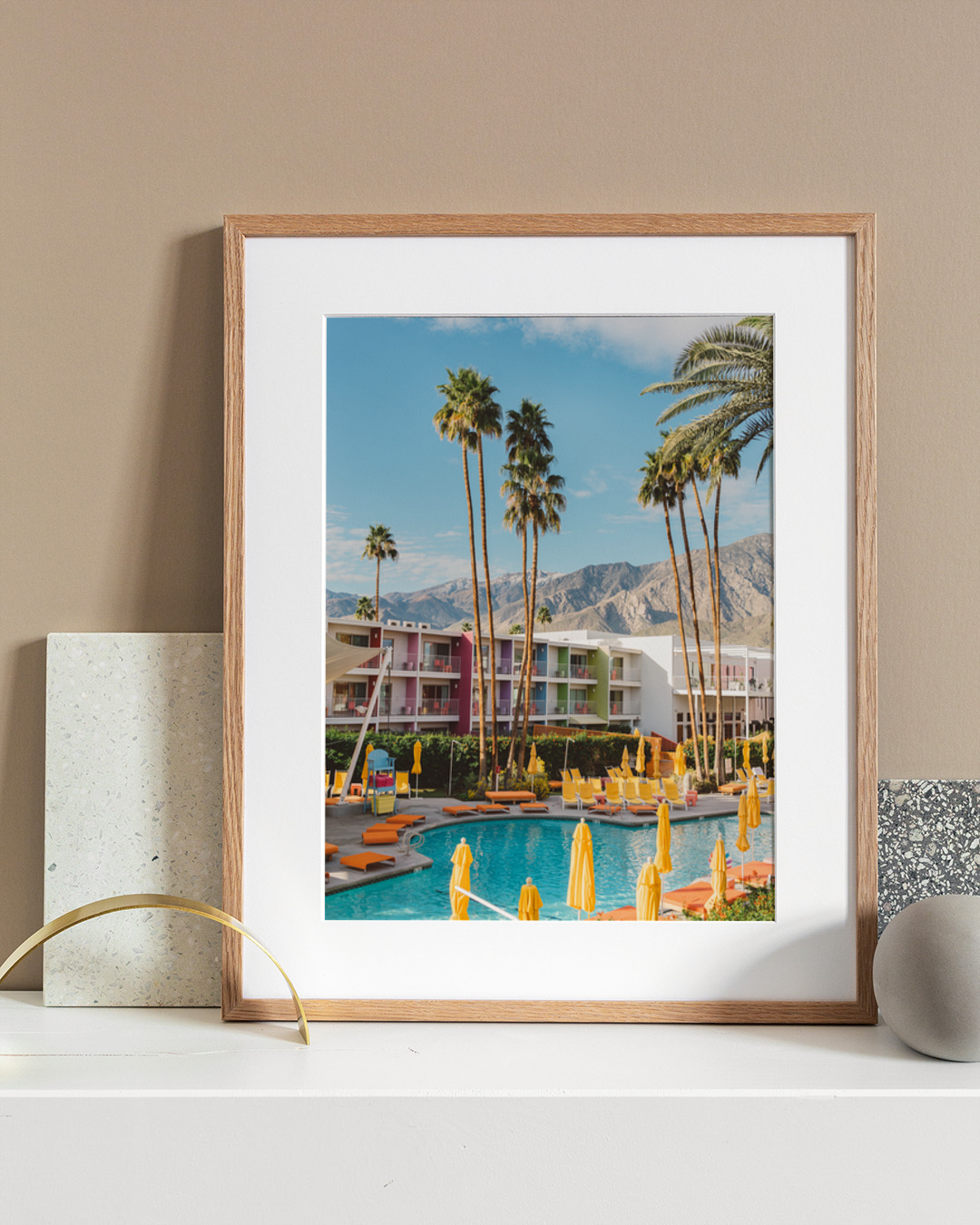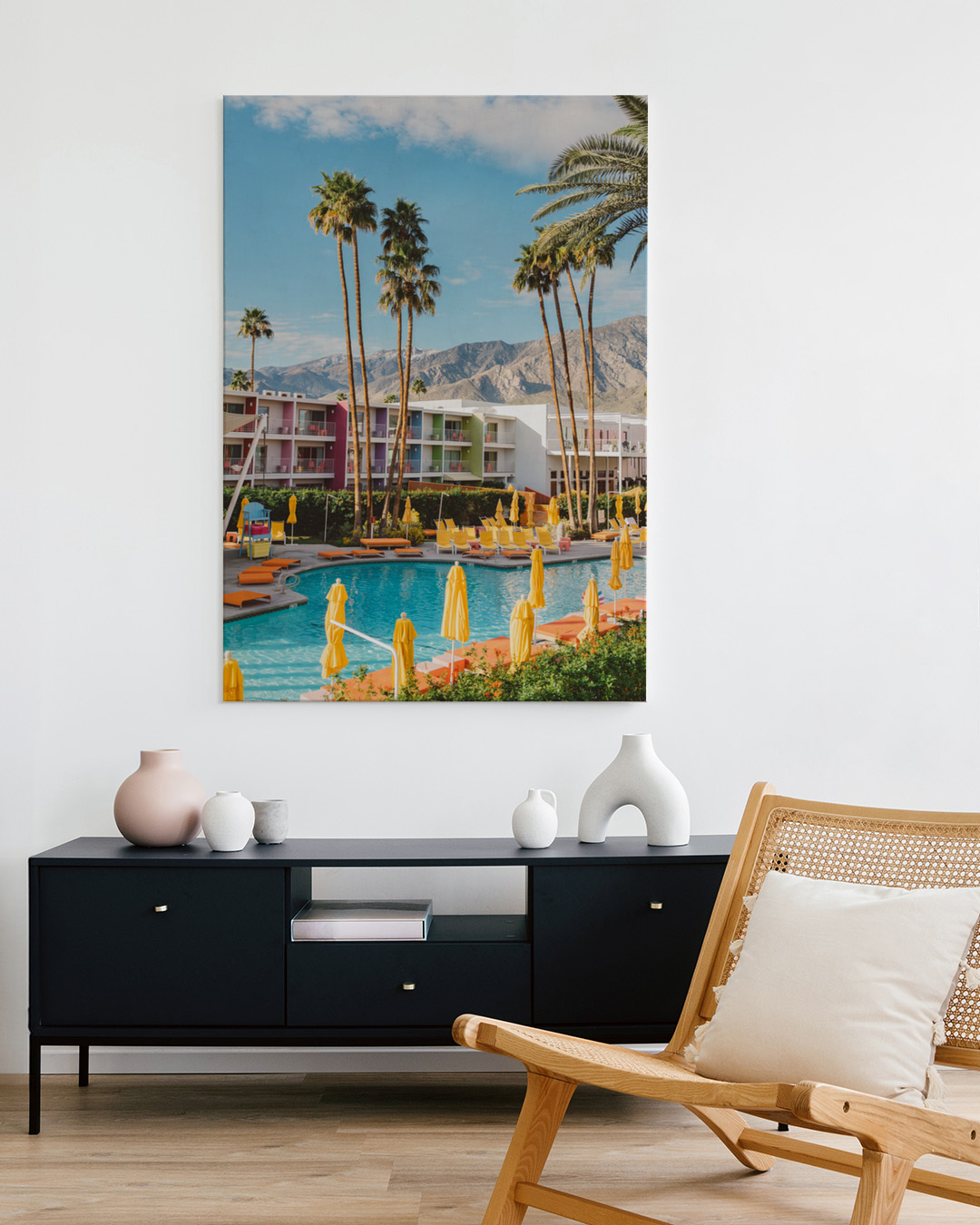 Dette fantastiske fotografi fanger et luksuriøst Palm Springs resort, der fremviser livlige farver og en forfriskende pool mod en bjergrig baggrund. Oplev tiltrækningen af en solfyldt oase med ikonisk ørkenarkitektur.