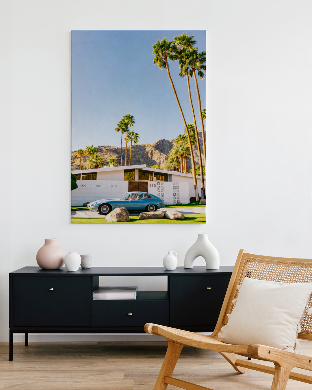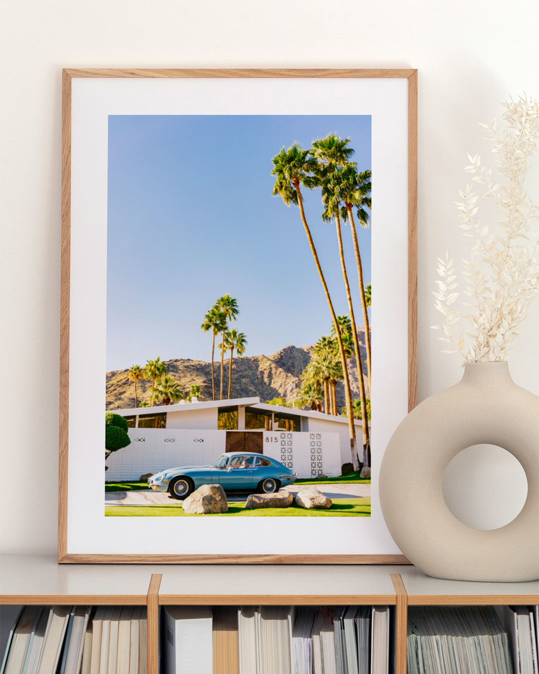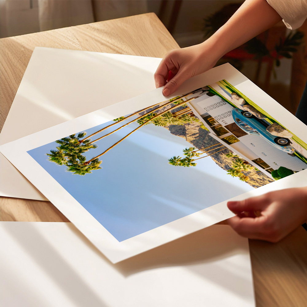 Fang essensen af Palm Springs med dette vintage-inspirerede fotografi, der viser en klassisk bil parkeret foran mid-century arkitektur og høje palmer under en levende blå himmel.