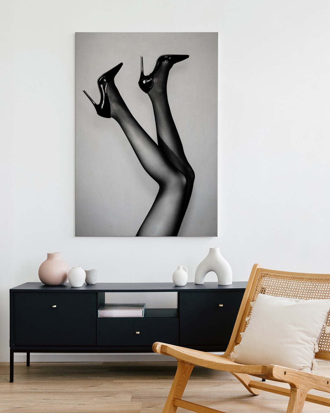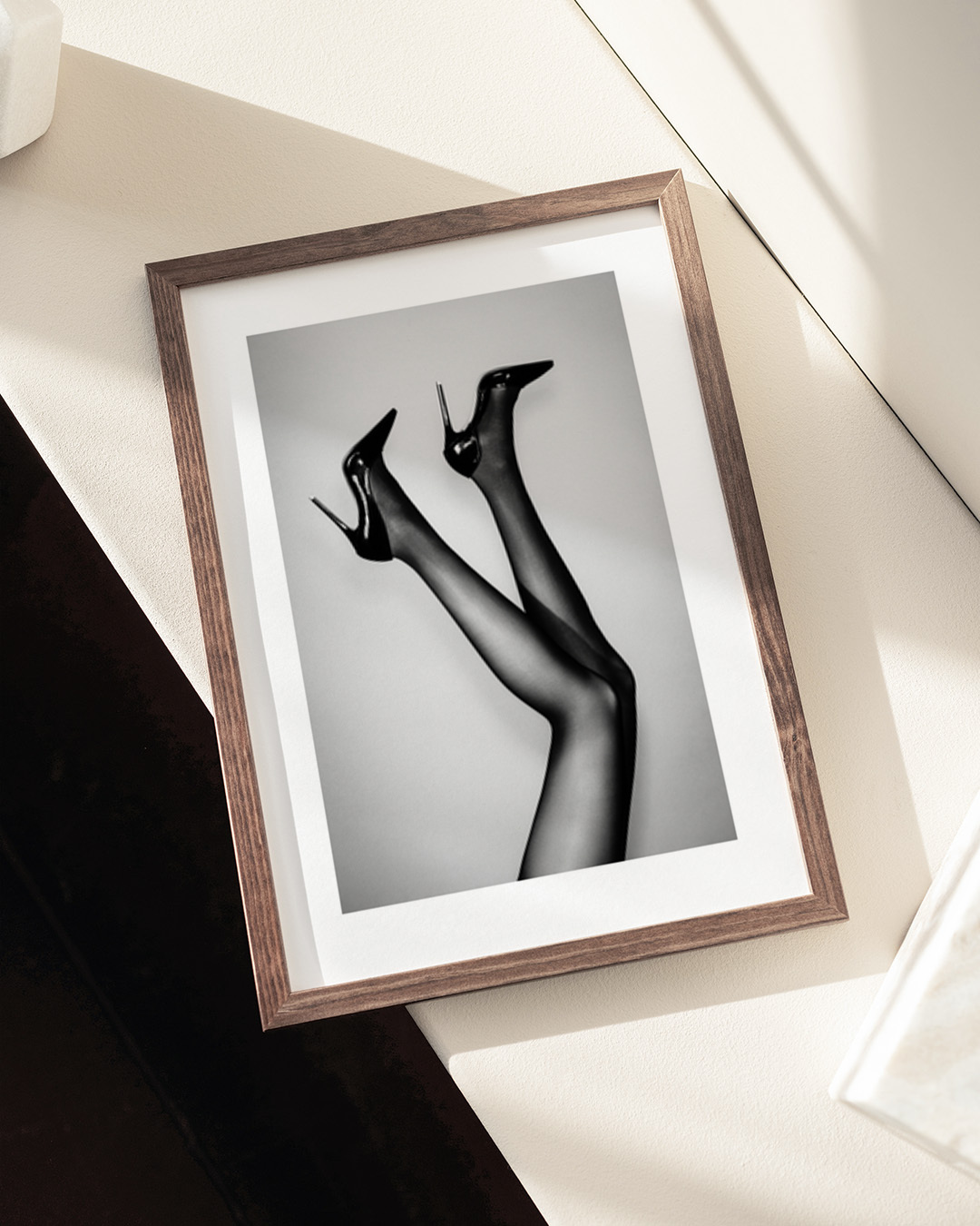Et slående sort-hvidt fotografi, der viser elegant placerede ben prydet med stilfulde høje hæle, fanger essensen af klassisk mode.