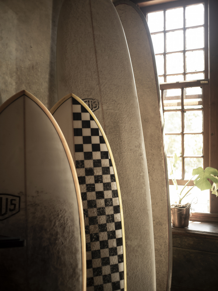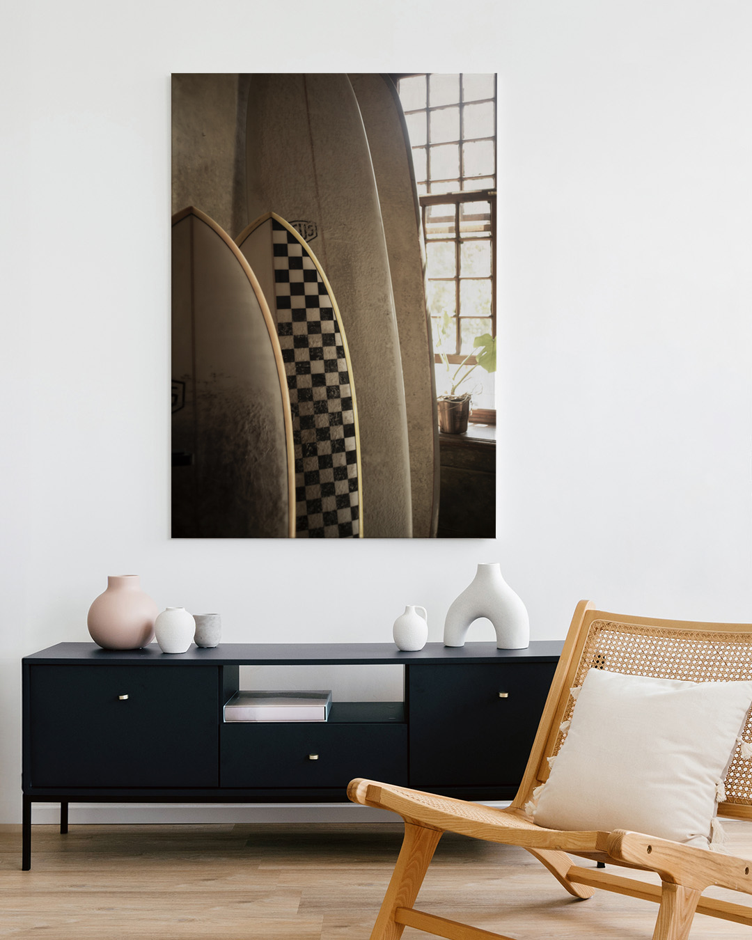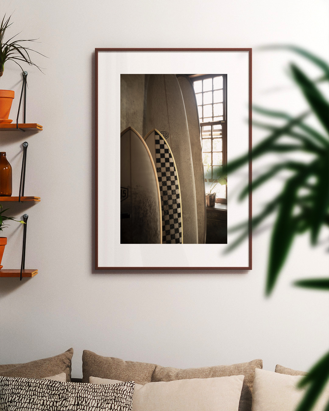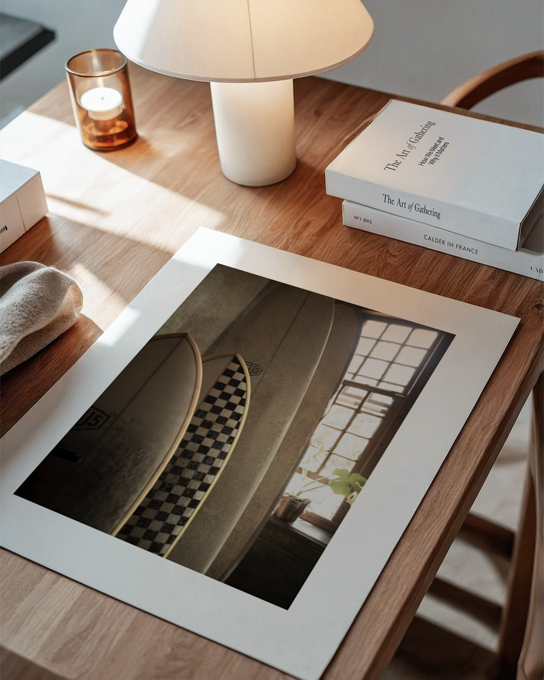 Fang den rolige essens af surfing med dette fredelige fotografi af surfbrætter badet i blødt sollys ved et vindue. Perfekt til dem, der finder fred i bølgerne.