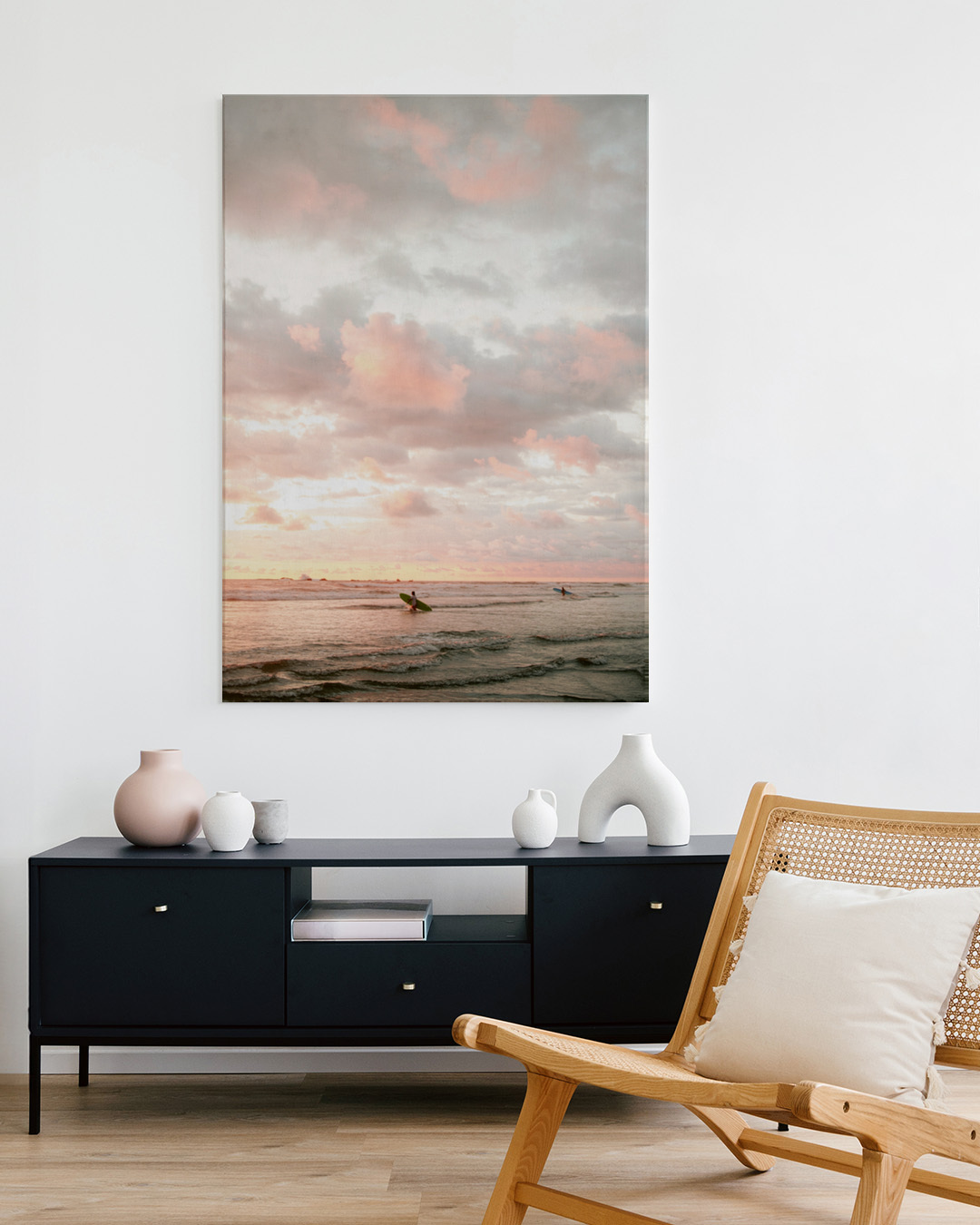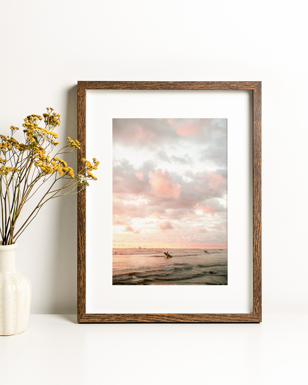 Oplev roen i en pastelrosa solnedgang, mens surfere nyder de stille bølger. Denne fredfyldte scene fremkalder naturens ånd og eventyr, perfekt for dem der elsker havet og udendørssport.