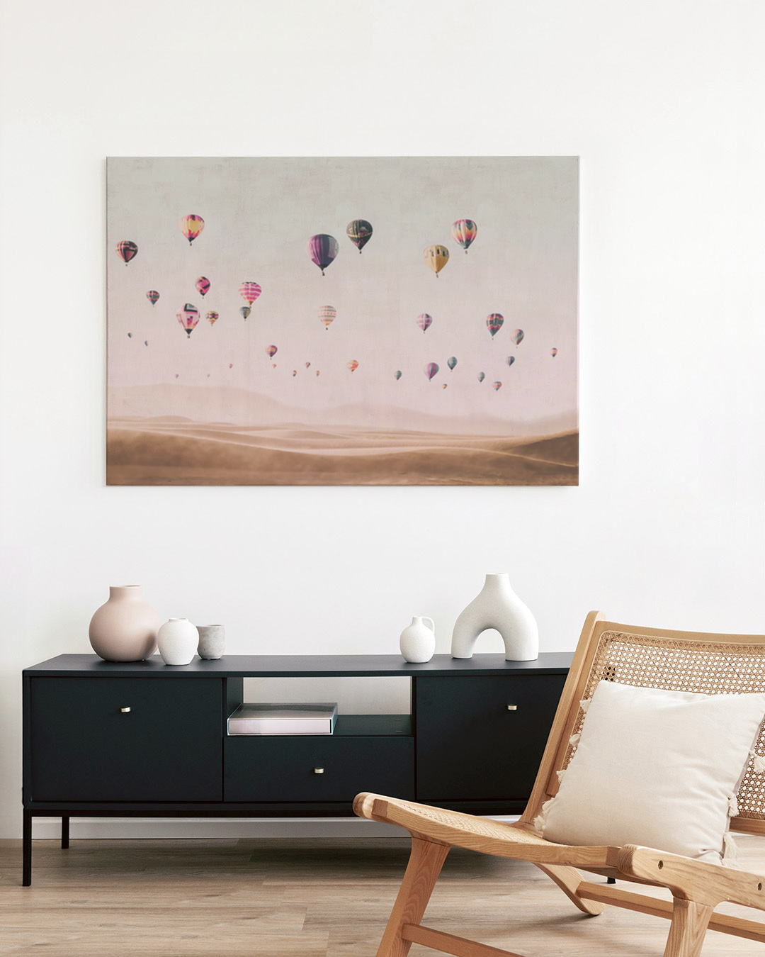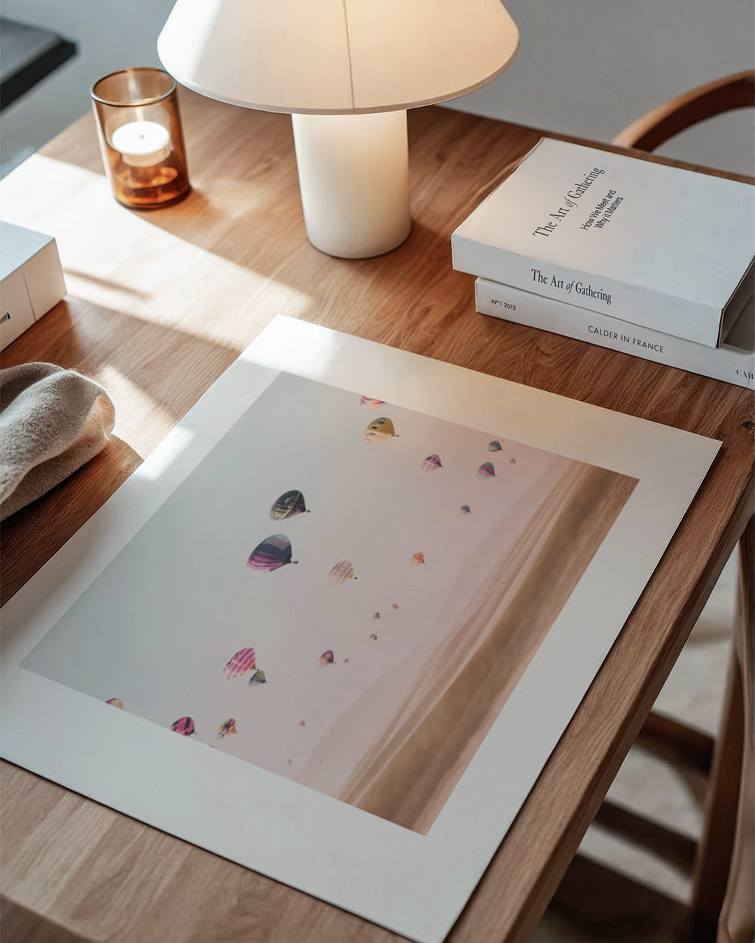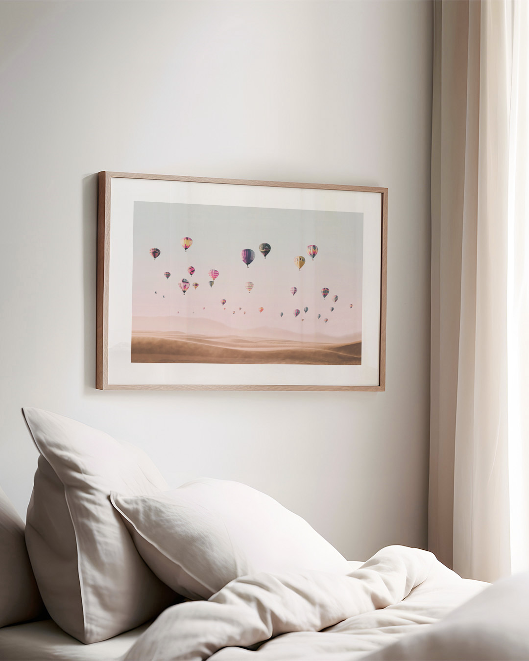 Et spændende fotografi af Kathrin Pienaar, der viser adskillige varmluftsballoner, der svæver yndefuldt over vidstrakte ørkenklitter. Pastelfarverne skaber en rolig og drømmende atmosfære, der inviterer til eventyr.