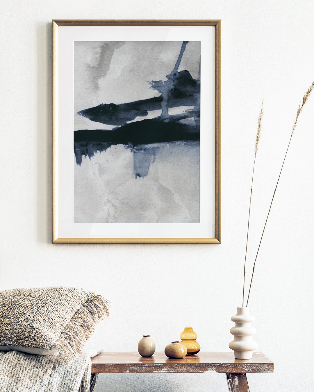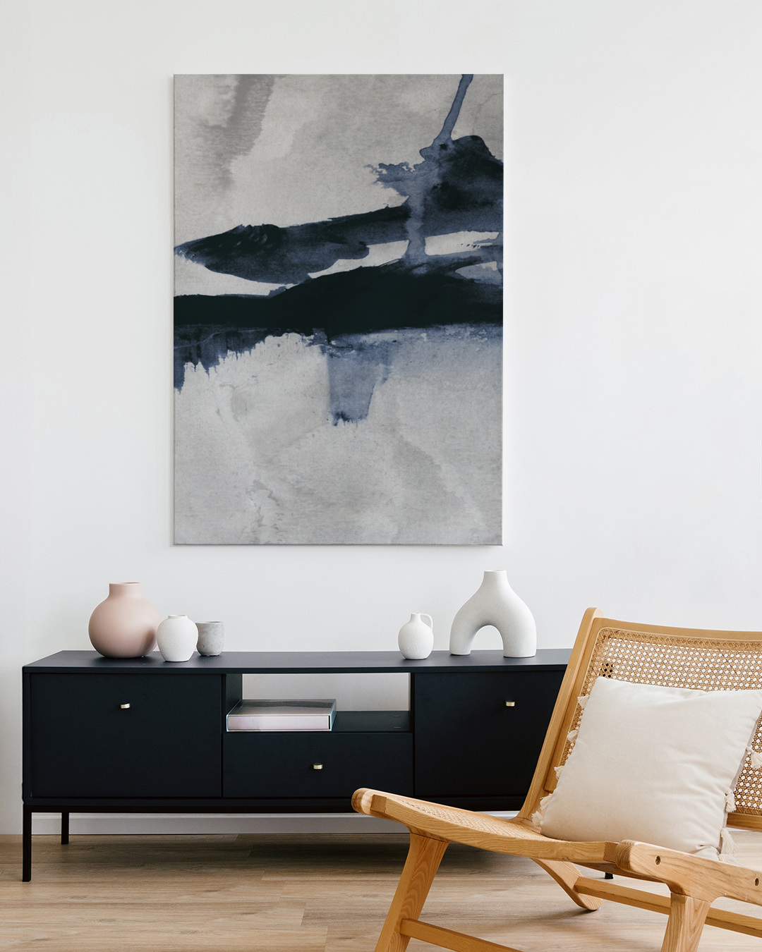 Den opstrakte lærred er indrammet med en elegant svæveramme i ægte træ for et stilrent udseende og ekstra dimension. Afstanden mellem lærredet og rammen skaber en svævende effekt.