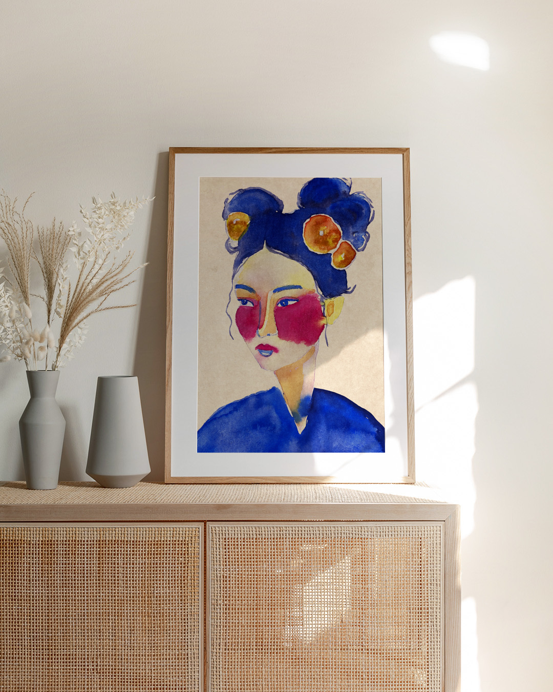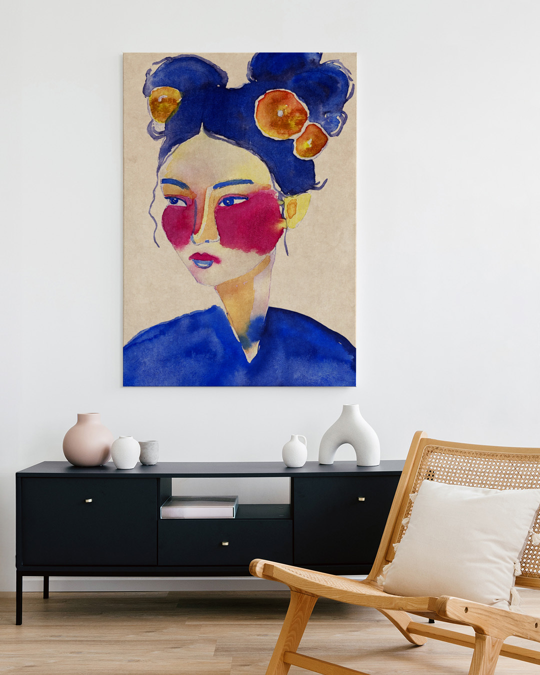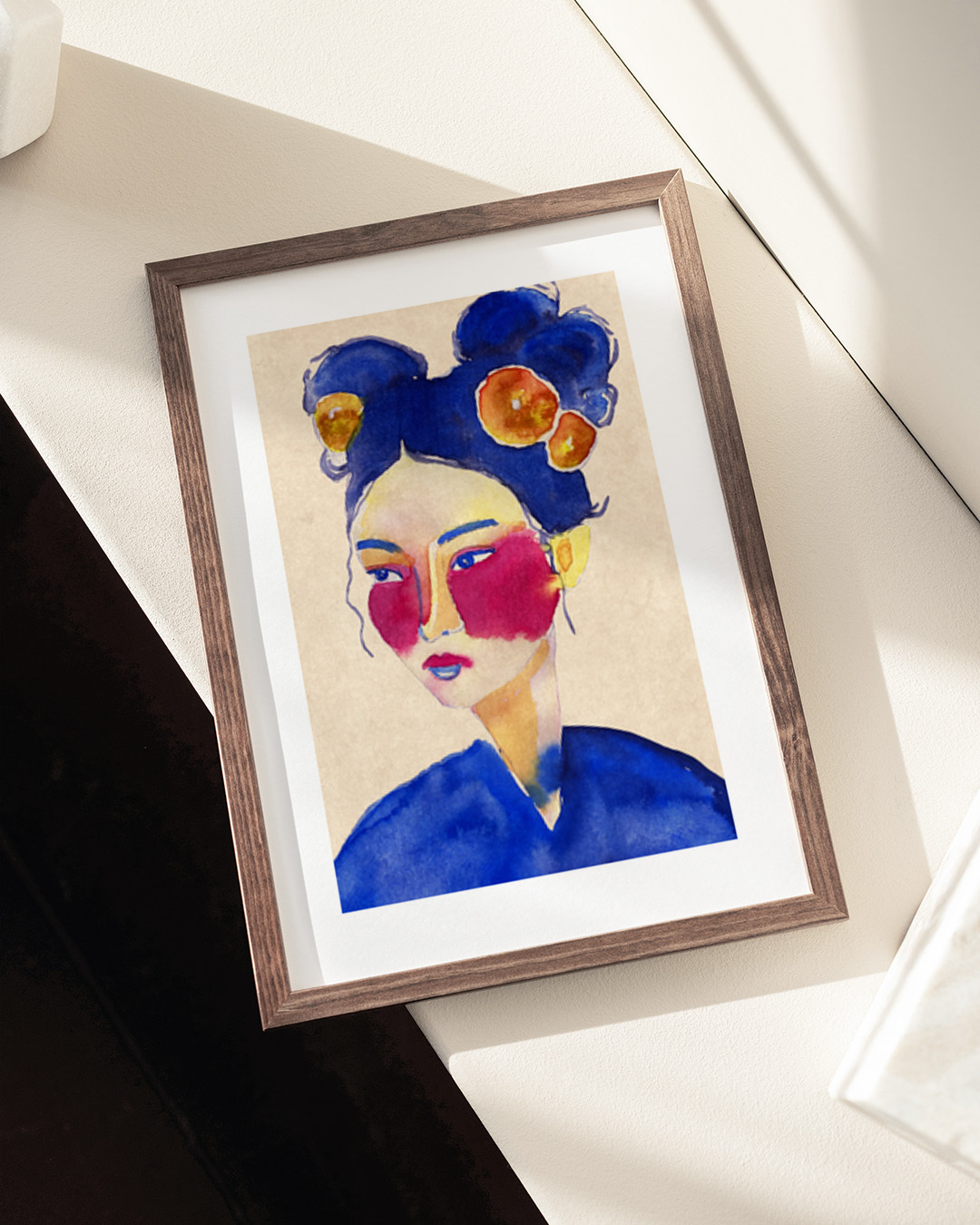 Dette udtryksfulde akvarelportræt af Raissa Oltmanns viser en kvinde med iøjnefaldende farver. Hendes eftertænksomme udtryk er smukt fanget i levende rød og blå.