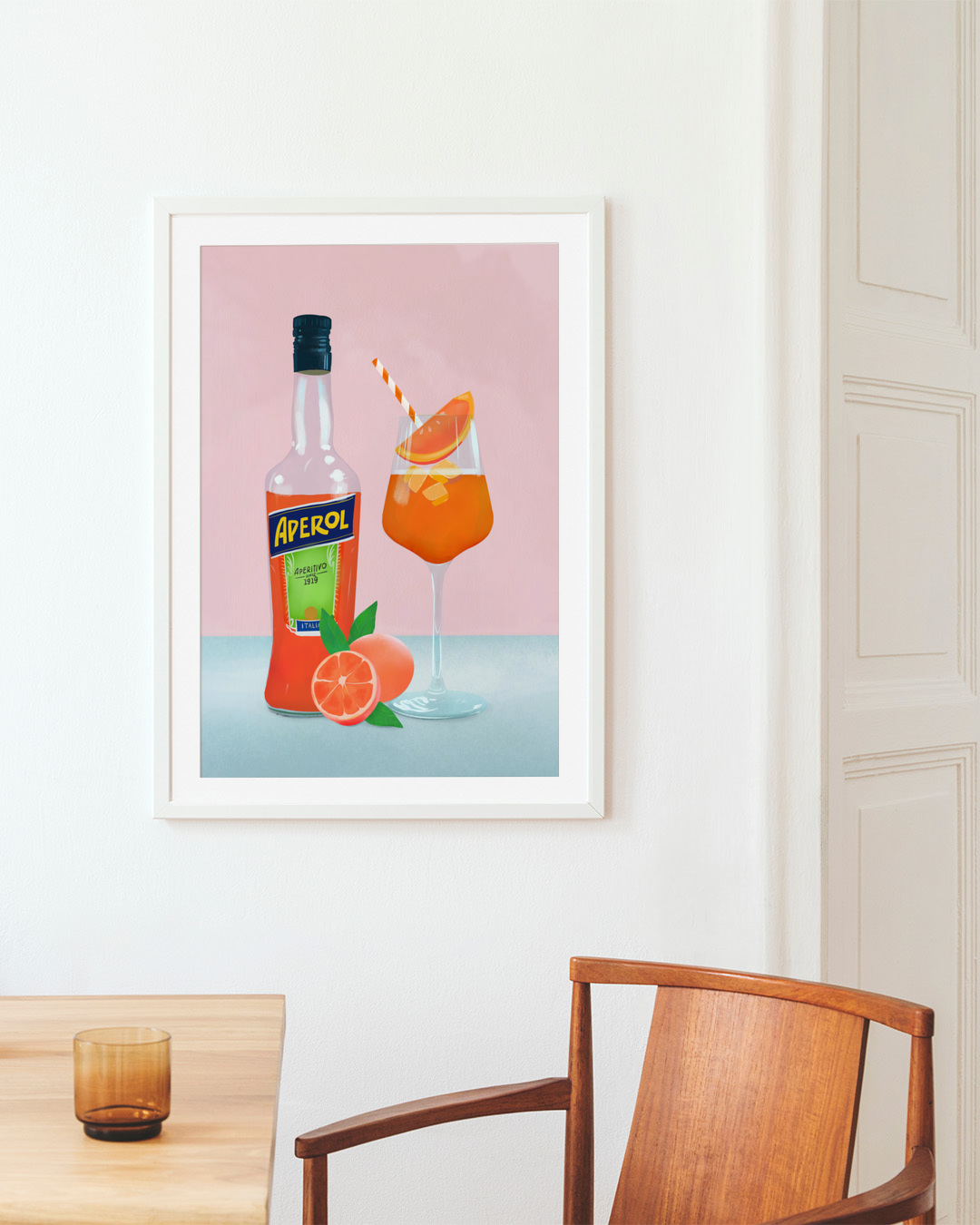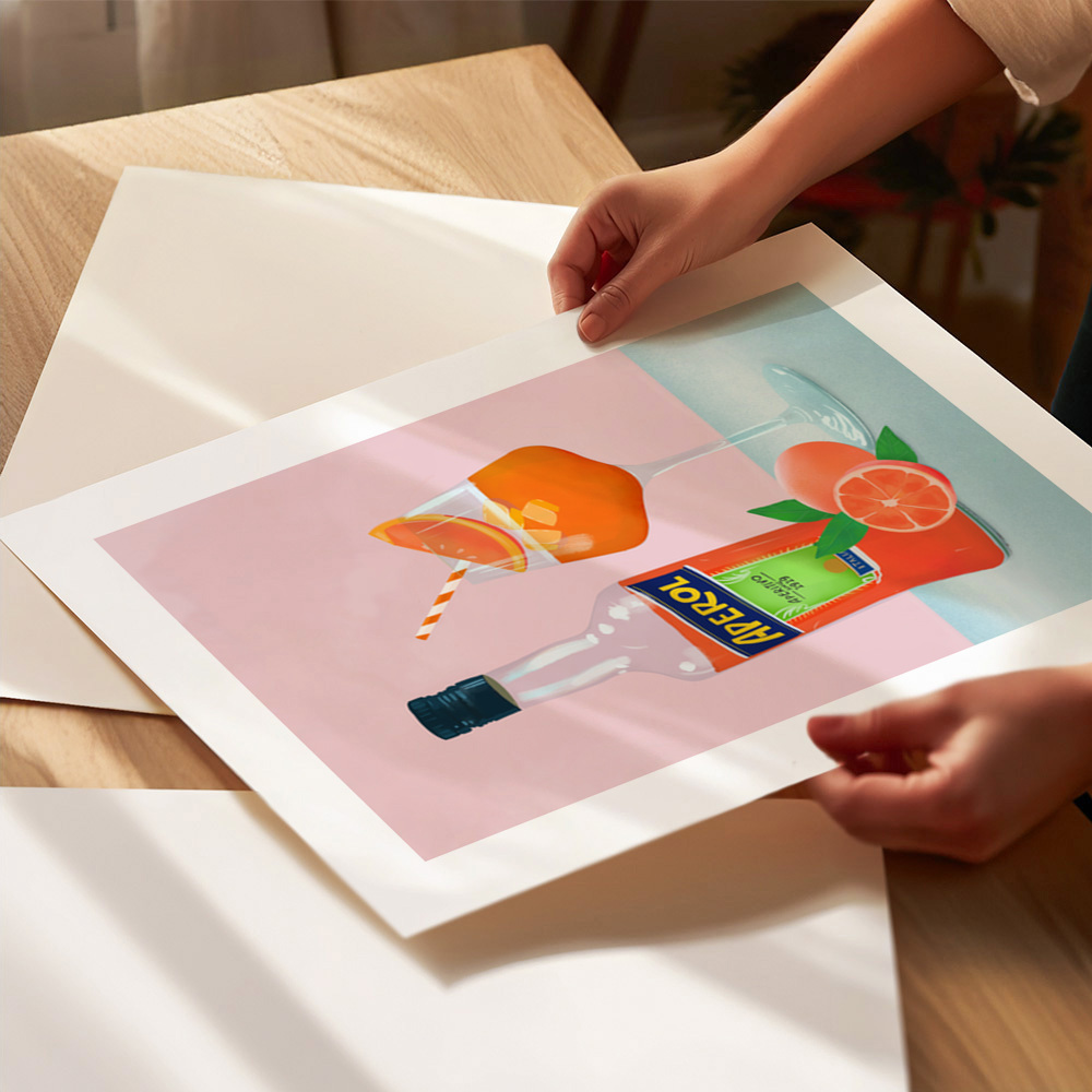 Denne levende illustration viser en forfriskende Aperol Spritz ledsaget af skåret citrusfrugt mod en dejlig pink baggrund, der fanger essensen af italiensk aperitifkultur.