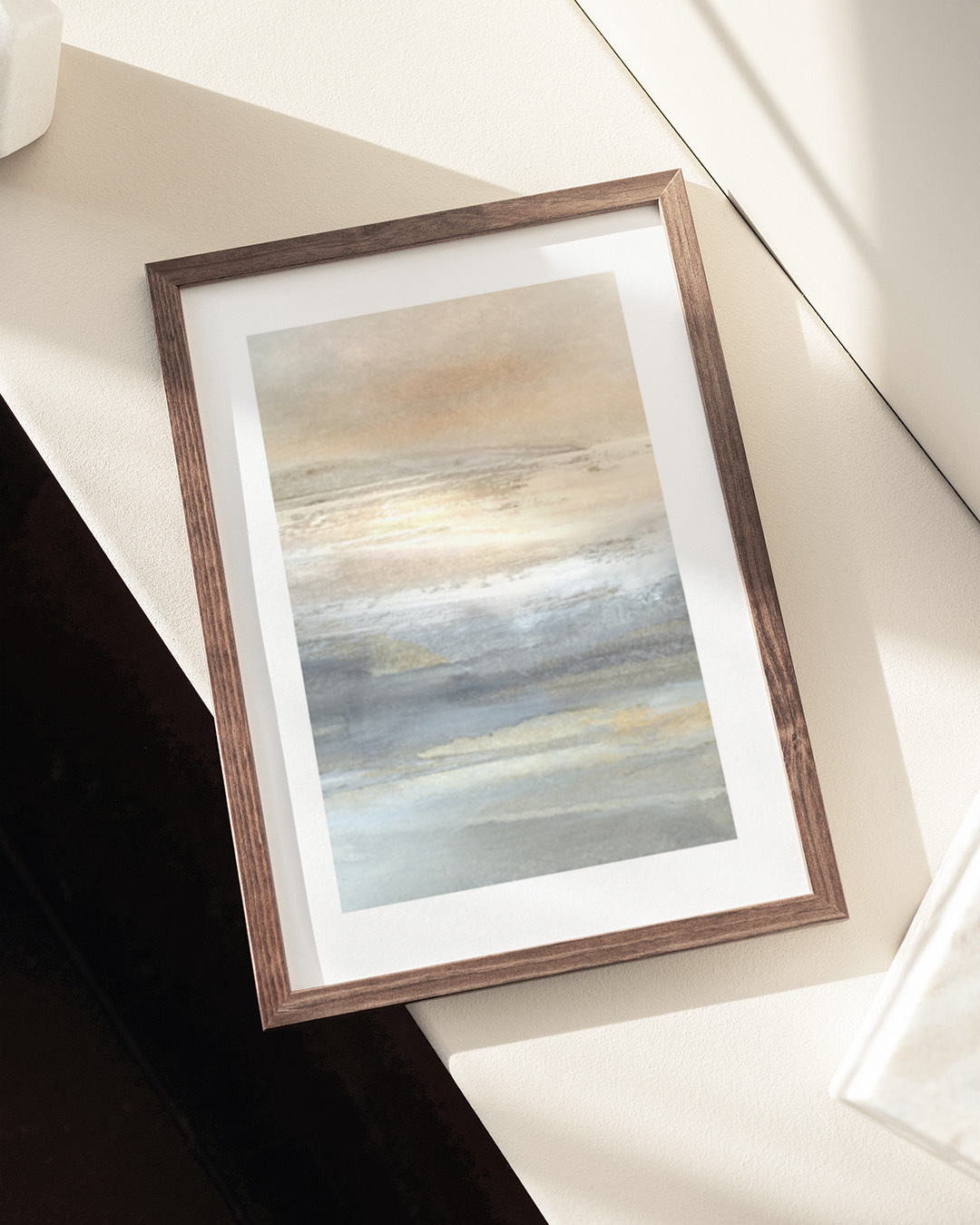 Den opstrakte lærred er indrammet med en elegant svæveramme i ægte træ for et stilrent udseende og ekstra dimension. Afstanden mellem lærredet og rammen skaber en svævende effekt.