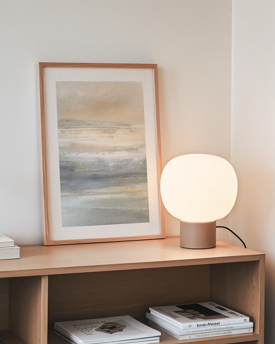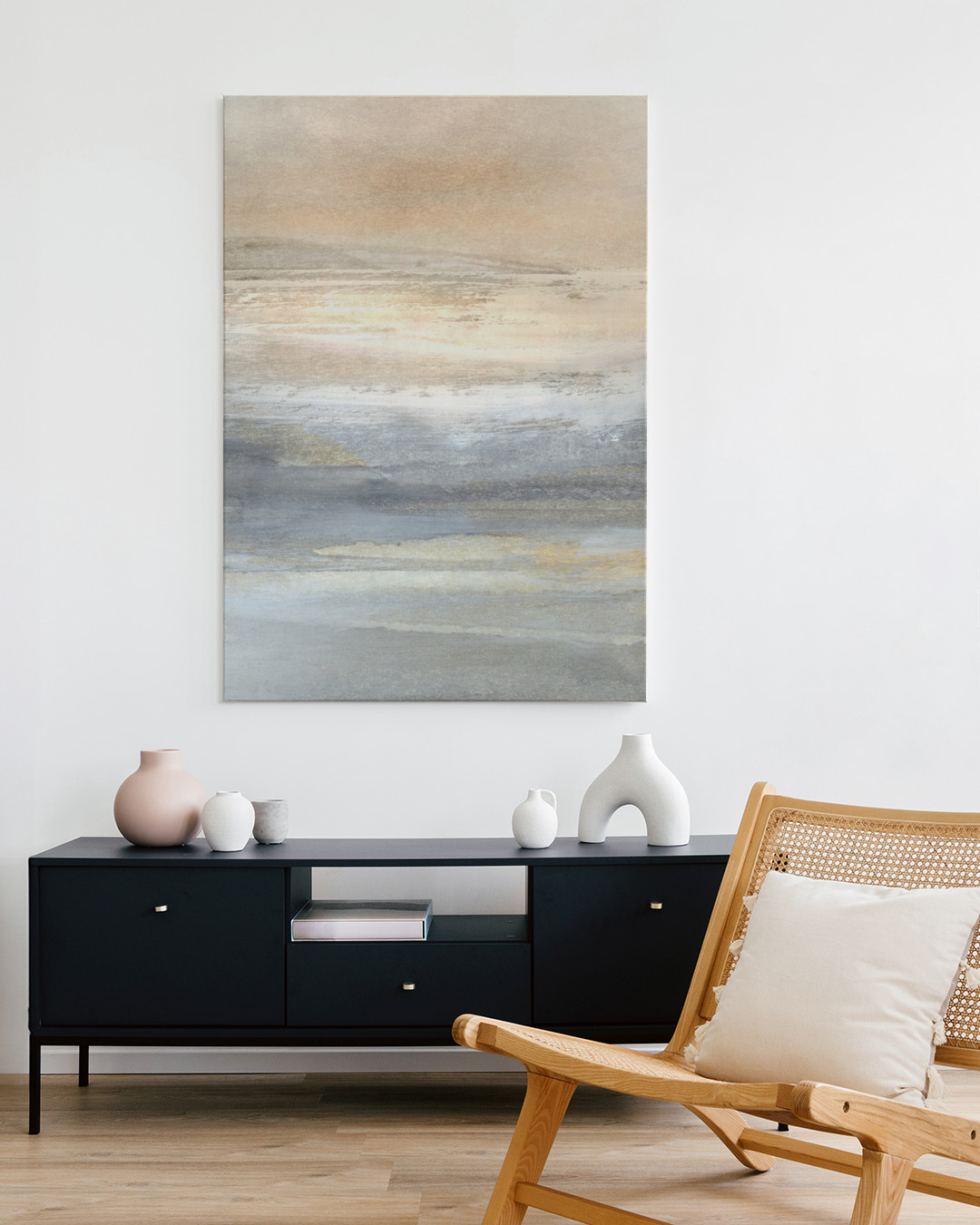 Dan Hobdays bløde abstrakte landskabsmaleri har blide nuancer af beige og grå og skaber en rolig og beroligende atmosfære. Perfekt til at bringe et strejf af ro til ethvert rum.