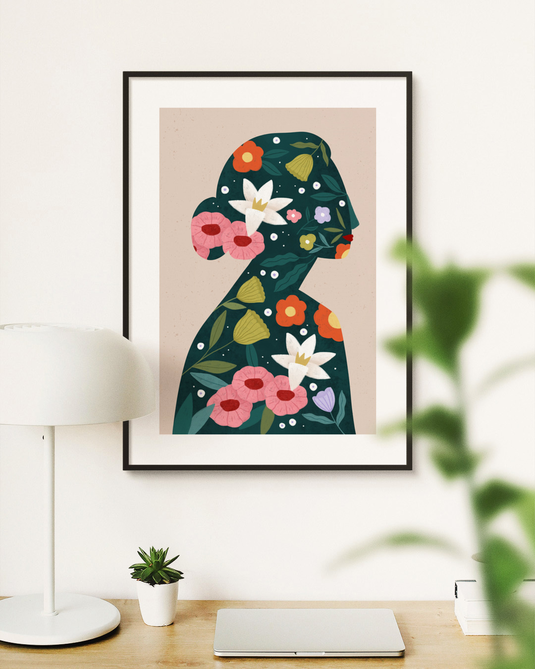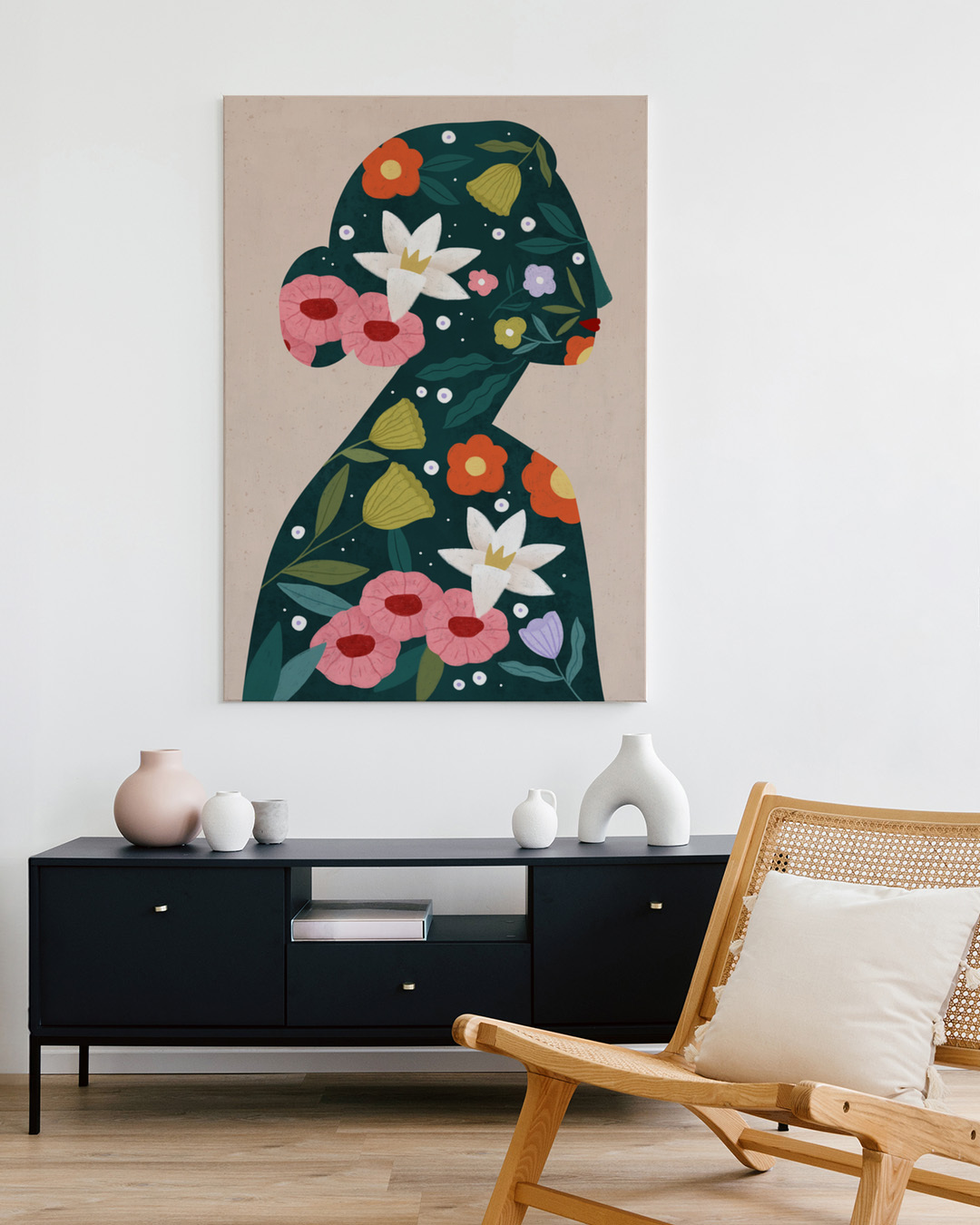 En fængslende illustration af Bea Müller, der viser en silhuet fyldt med levende blomster, herunder liljer og valmuer mod en dyb baggrund. Perfekt til at tilføje botanisk elegance til ethvert rum.