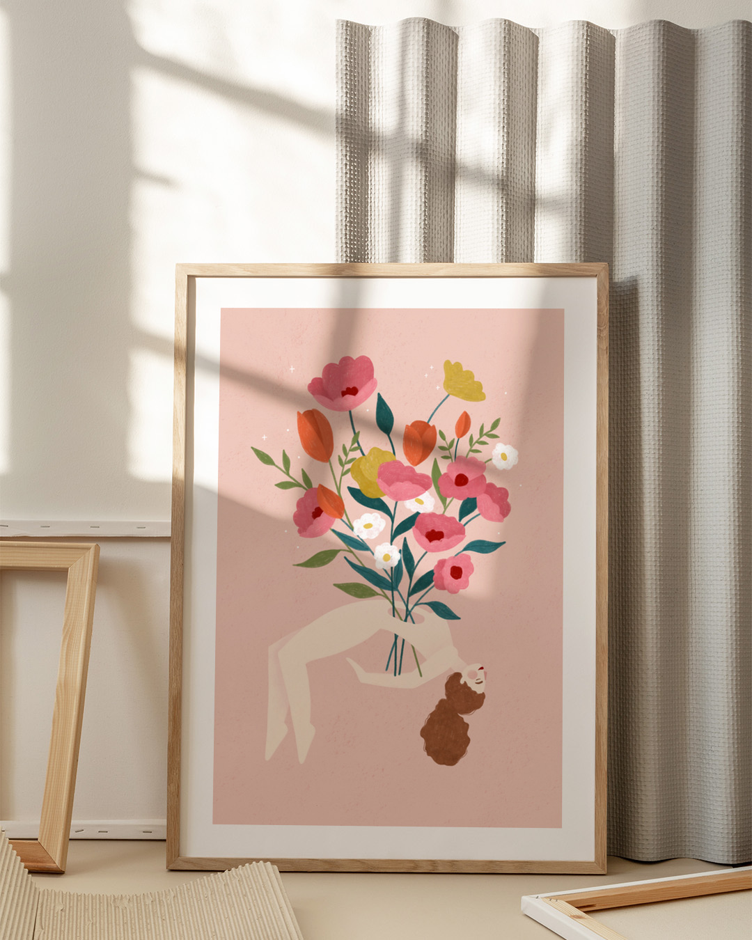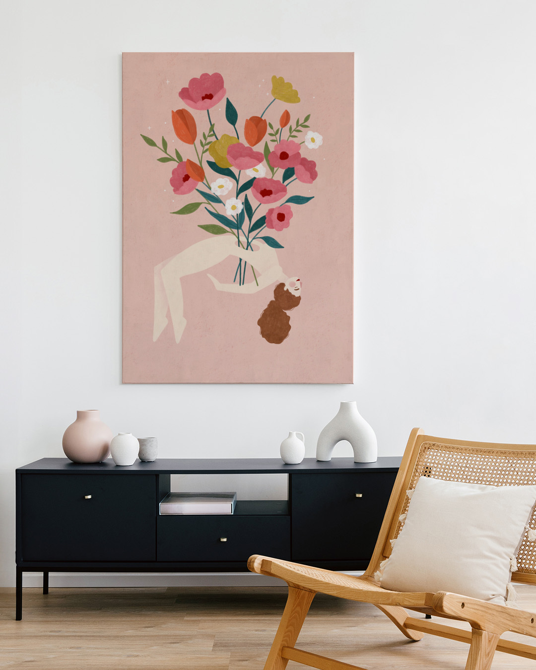 Bea Müllers illustration fanger en drømmelignende scene, hvor en figur svæver blandt livlige blomster i rød, pink og gul. Denne botaniske og rolige komposition kombinerer smukt natur med menneskelig form.