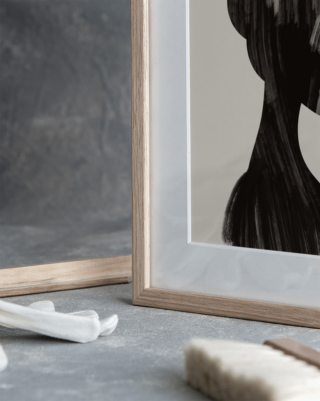 Den ekstra dybe og brede rammeprofil skaber stabilitet og et ægte blikfang på din væg. Håndlavet og afsluttet med et præcisionsskåret