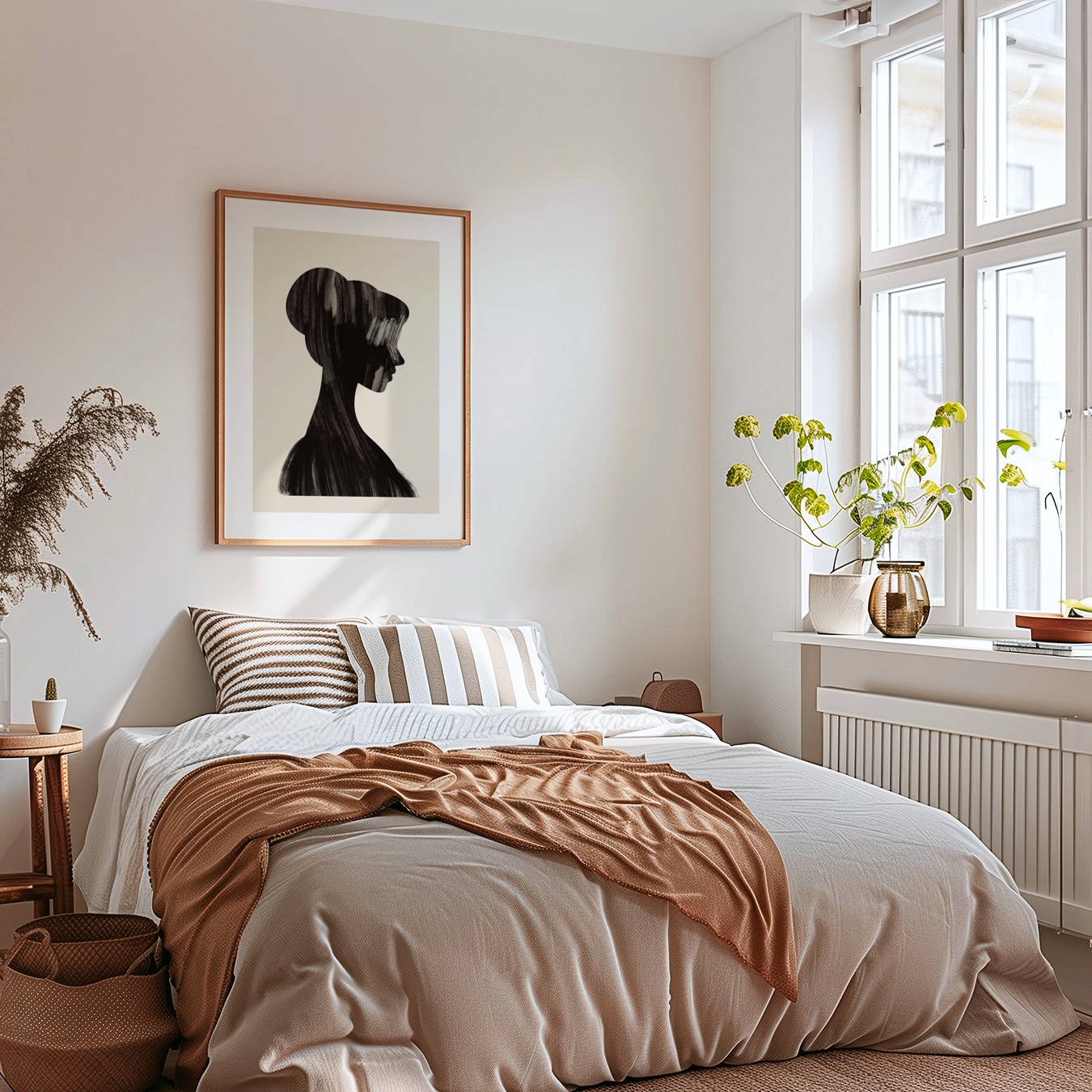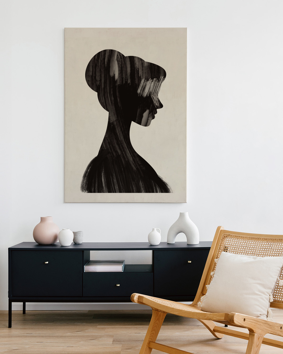 En raffineret silhuetskitse, der viser profilen af en elegant kvinde, afbildet gennem strategiske penselstrøg mod en subtil beige baggrund, der danner kontrast og fremhæver den sorte form.