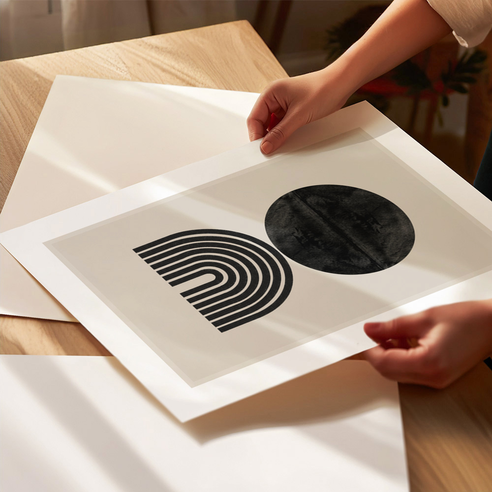 Et iøjnefaldende geometrisk kunsttryk med indviklede sorte former mod en lys baggrund, der skaber en tidløs, sofistikeret æstetik. Ideel til at tilføje et minimalistisk touch til moderne interiører.