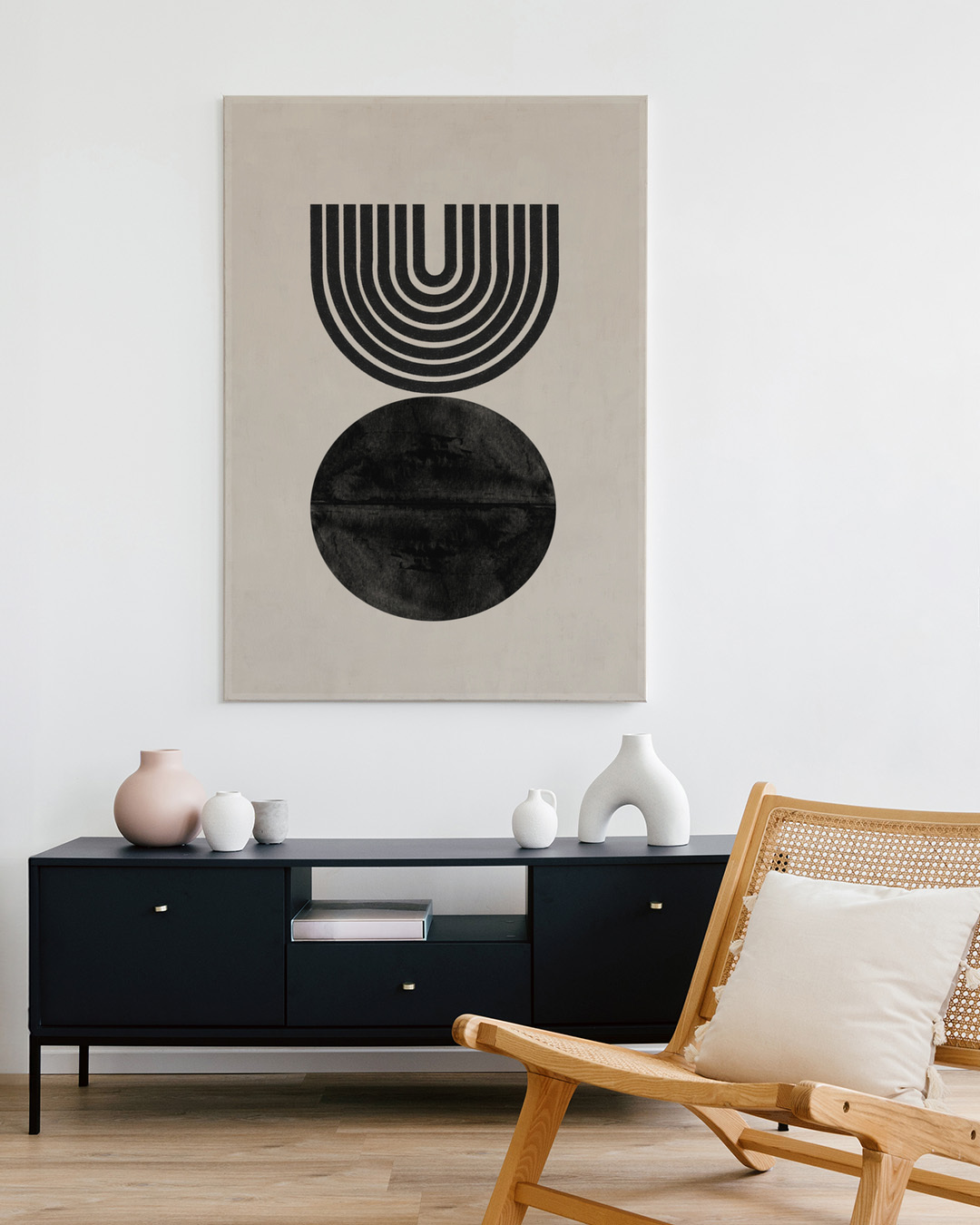 Den opstrakte lærred er indrammet med en elegant svæveramme i ægte træ for et stilrent udseende og ekstra dimension. Afstanden mellem lærredet og rammen skaber en svævende effekt.