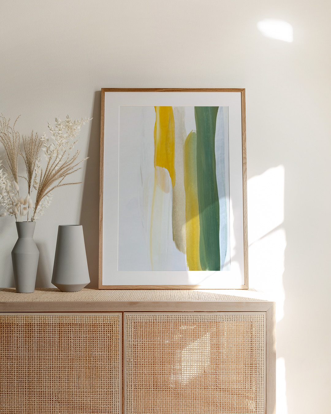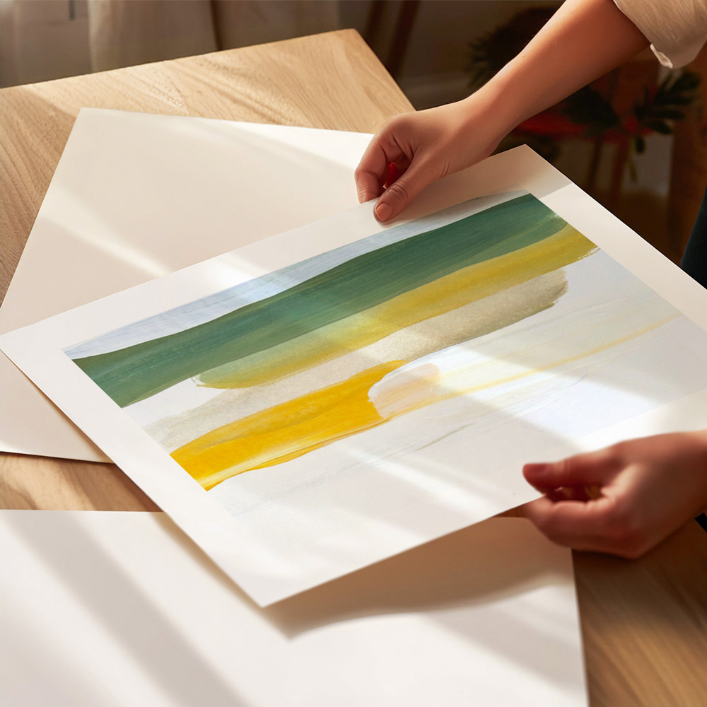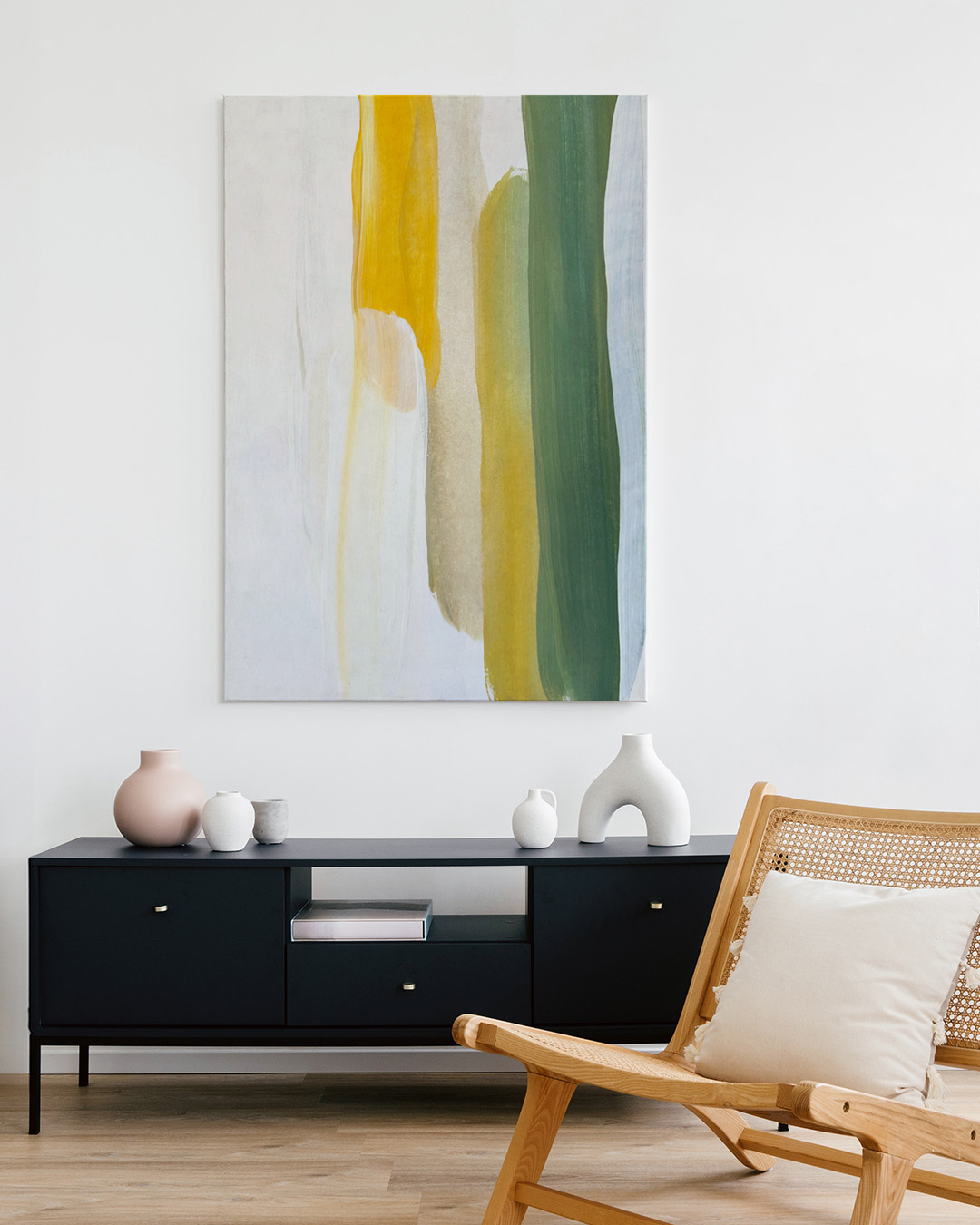 Et subtilt men fængslende abstrakt værk med elegante penselstrøg i gule og grønne toner. Det blide farvespil skaber en harmonisk visuel oplevelse, perfekt til alle moderne omgivelser.