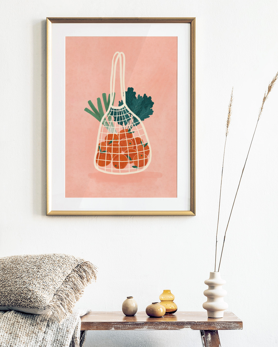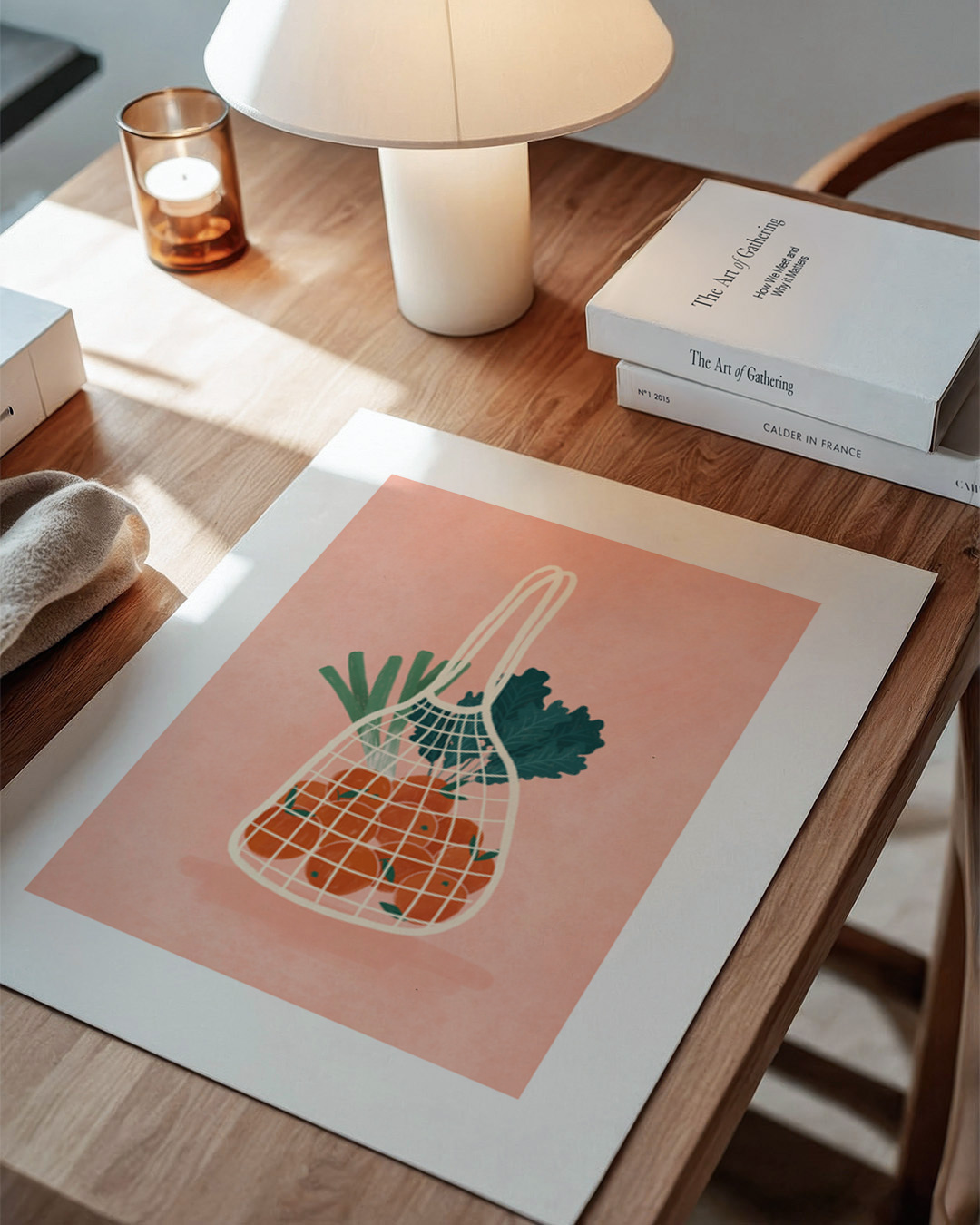 En charmerende illustration af en netpose fyldt med friske grøntsager og saftige appelsiner, der er perfekt til at tilføje en kulinarisk stemning til dit køkken. Skabt af Bea Müller, bringer dette kunstværk en varm og indbydende atmosfære.