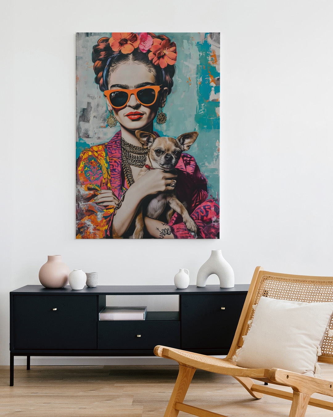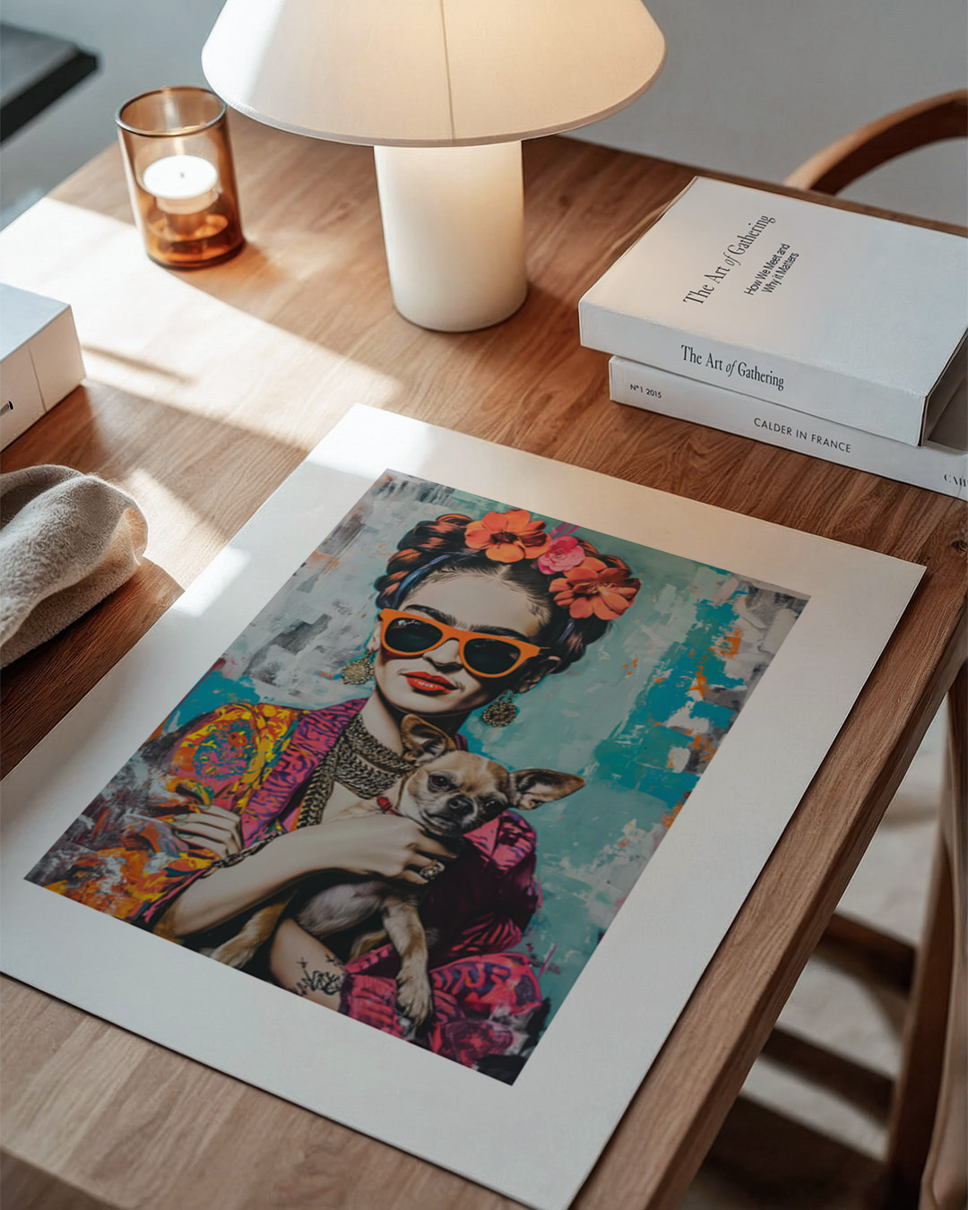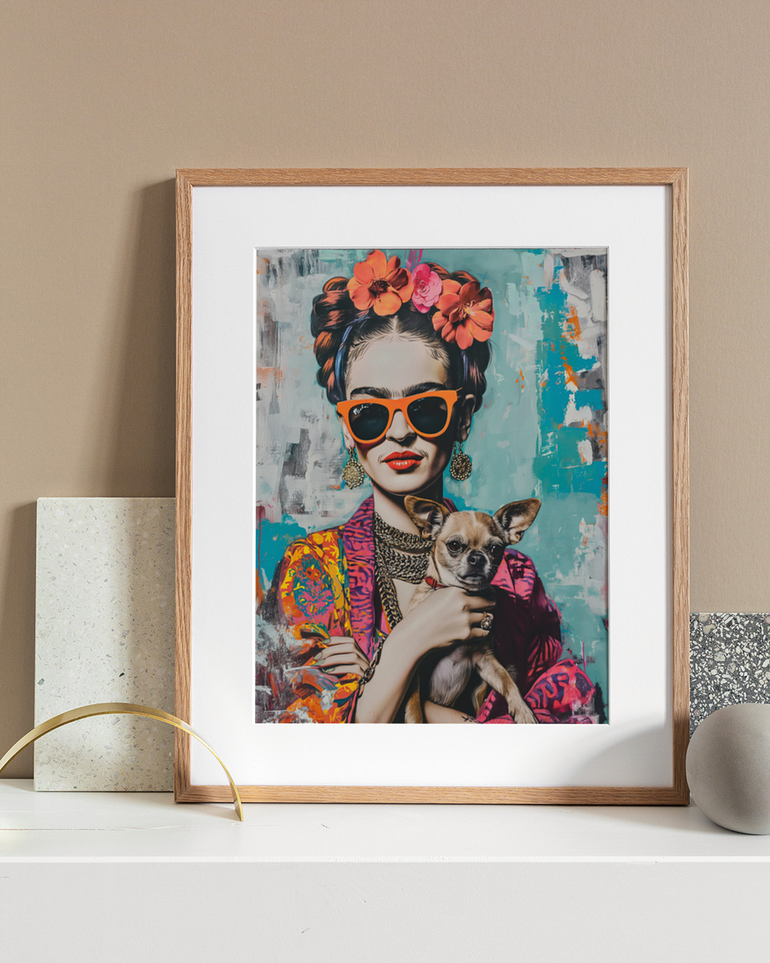 En livlig illustration med en legesyg skildring af en Frida Kahlo-lookalike med solbriller, der holder en charmerende chihuahua. De stærke farver og drilske detaljer gør dette kunstværk unikt.