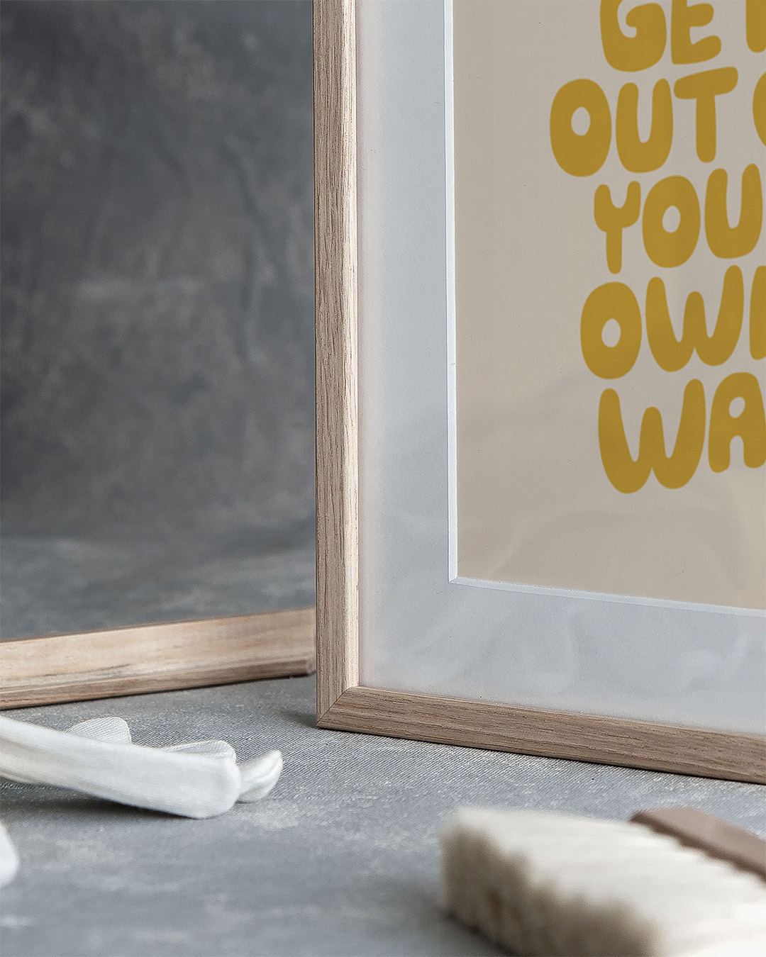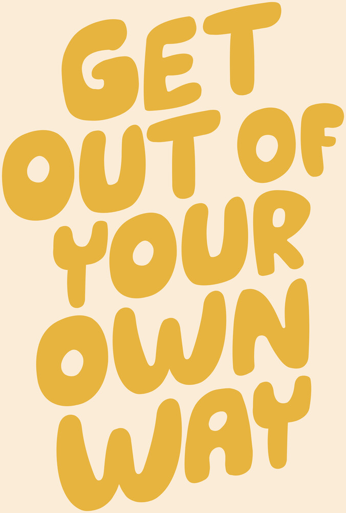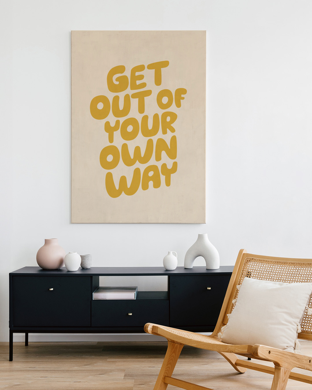Et inspirerende minimalistisk print med teksten 'Get out of your own way', der opmuntrer til motivation og personlig udvikling. Den bløde beige baggrund komplimenterer den dristige orange tekst og gør det til et fremtrædende stykke til ethvert rum.