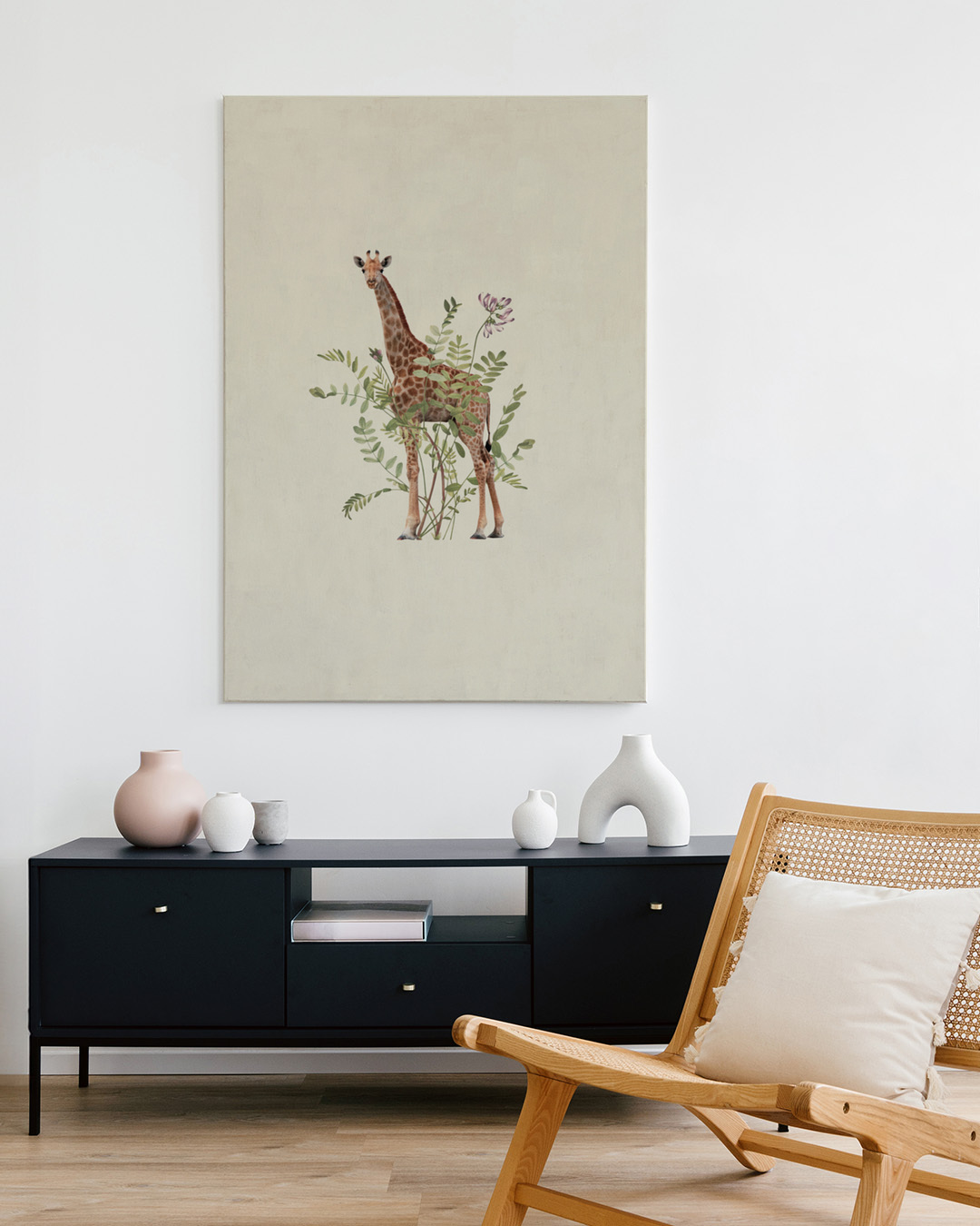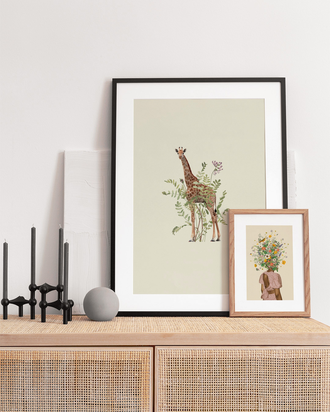 Denne fængslende illustration af Frida Floral Studio viser en giraf, der smukt er indflettet med frodige botaniske elementer, hvilket skaber en harmonisk blanding af dyreliv og natur.