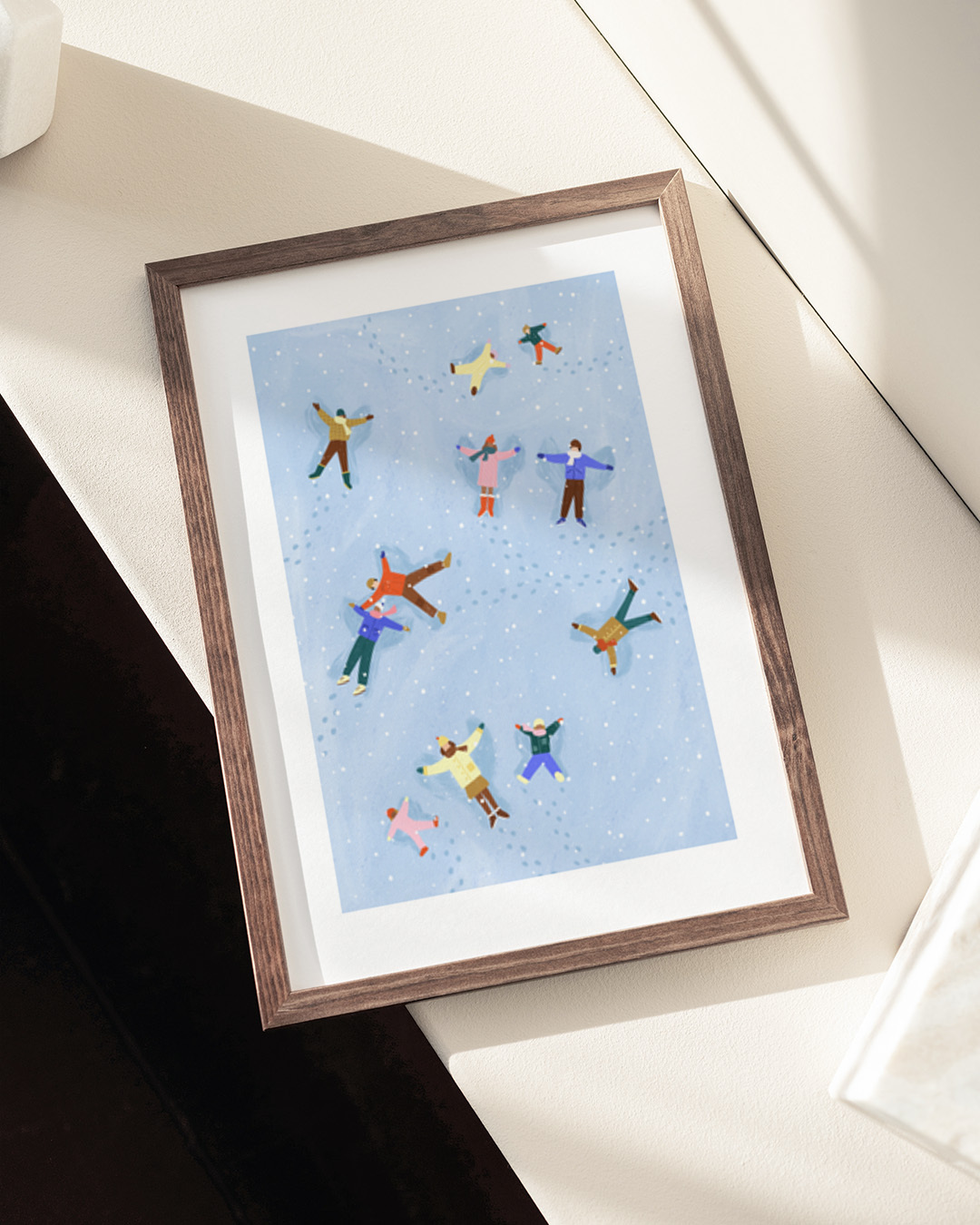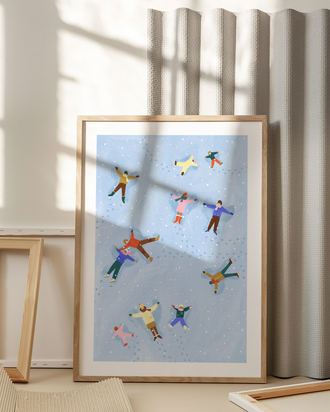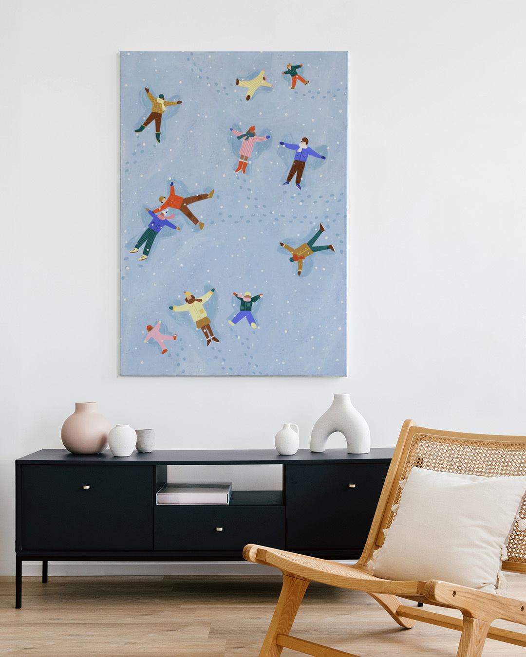 Bea Müllers kunstværk fanger en legende scene, hvor folk laver sneengle på en snebelagt jord for at fejre vinterens glæder. De livlige farver skaber et fantasifuldt, dynamisk vinterlandskab fyldt med glæde og bevægelse.