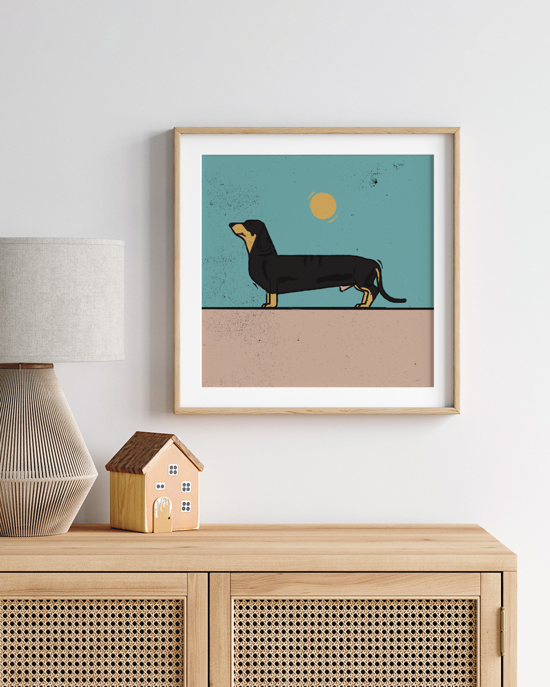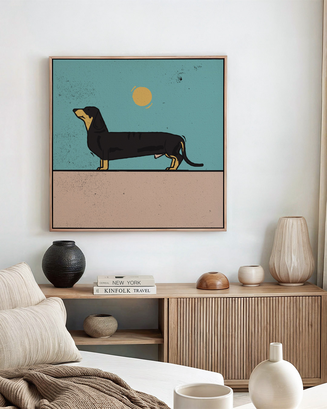 Dette stykke af Amer Karic viser en gravhund, der står selvsikkert mod en turkis himmel med en sol ovenfor. Det enkle design og de livlige farver giver en minimalistisk charme, der tilføjer et strejf af legefuldhed til ethvert rum.