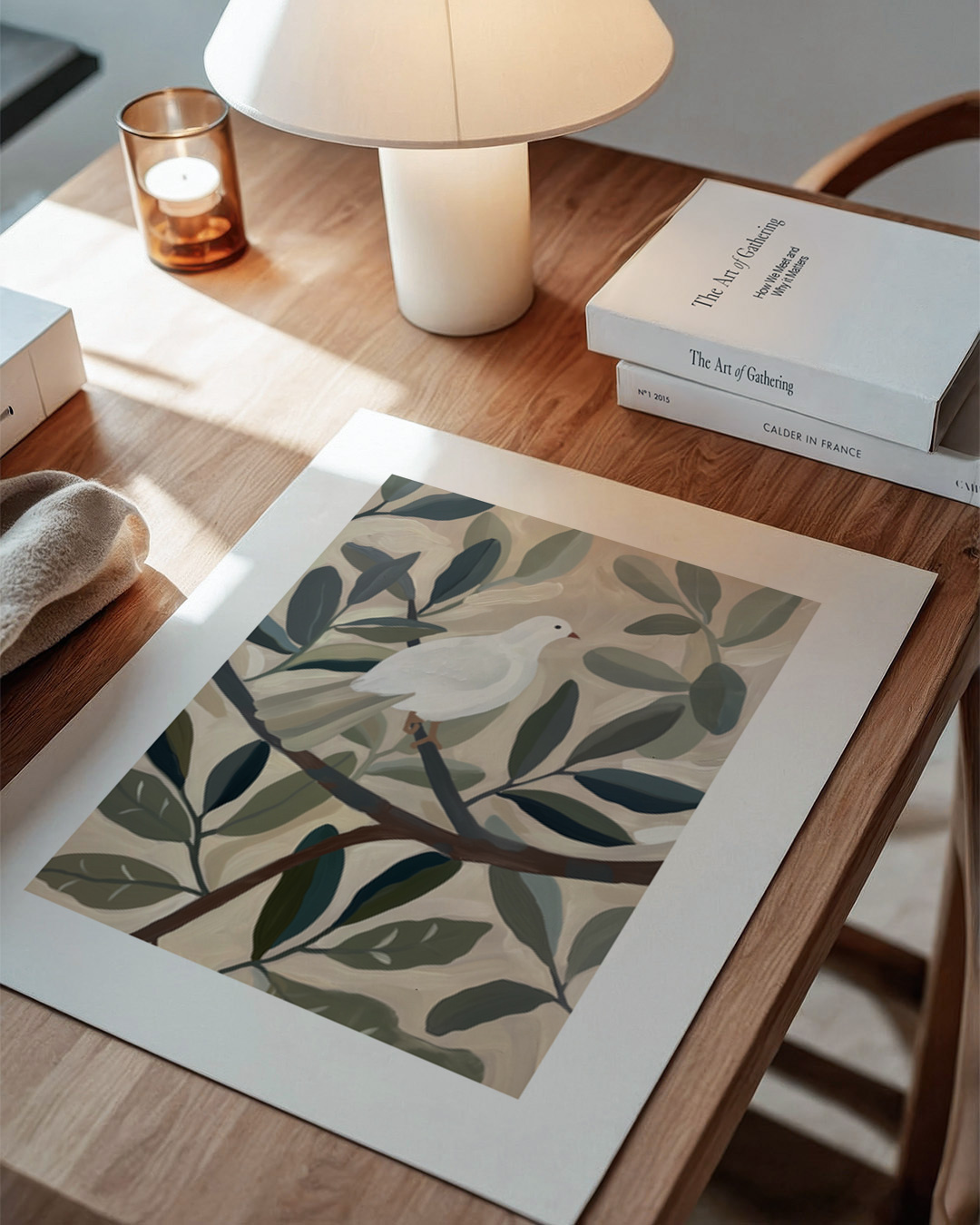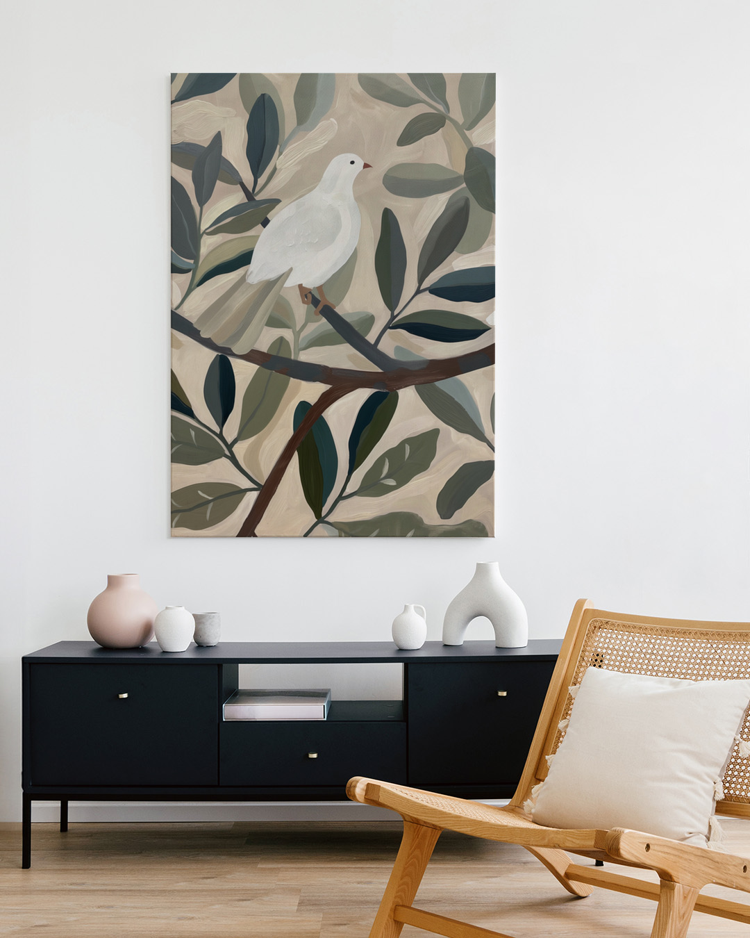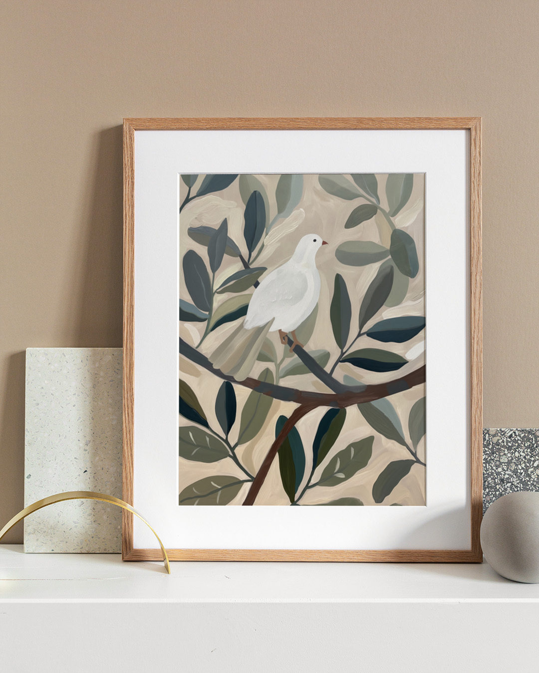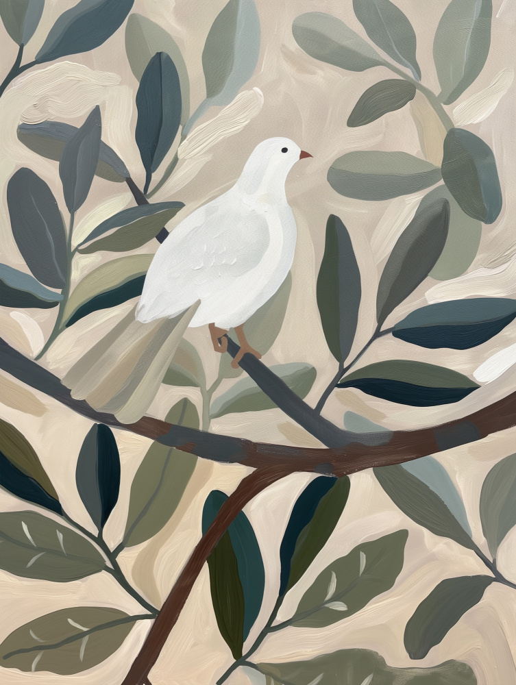 En fredelig illustration af en yndefuld hvid due, der sidder på en gren omgivet af frodige blade. Perfekt til at tilføje ro og natur til ethvert rum.