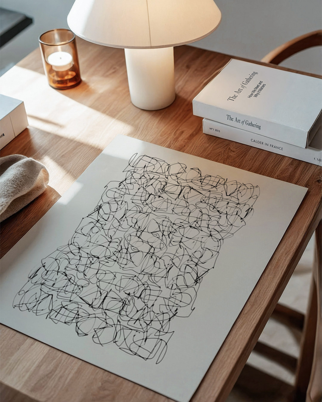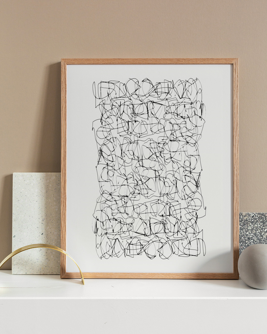 Dan Hobdays værk har slyngede sorte linjer, der er indviklet på en hvid baggrund. Det abstrakte design fanger opmærksomheden med sin detaljerede udførelse.
