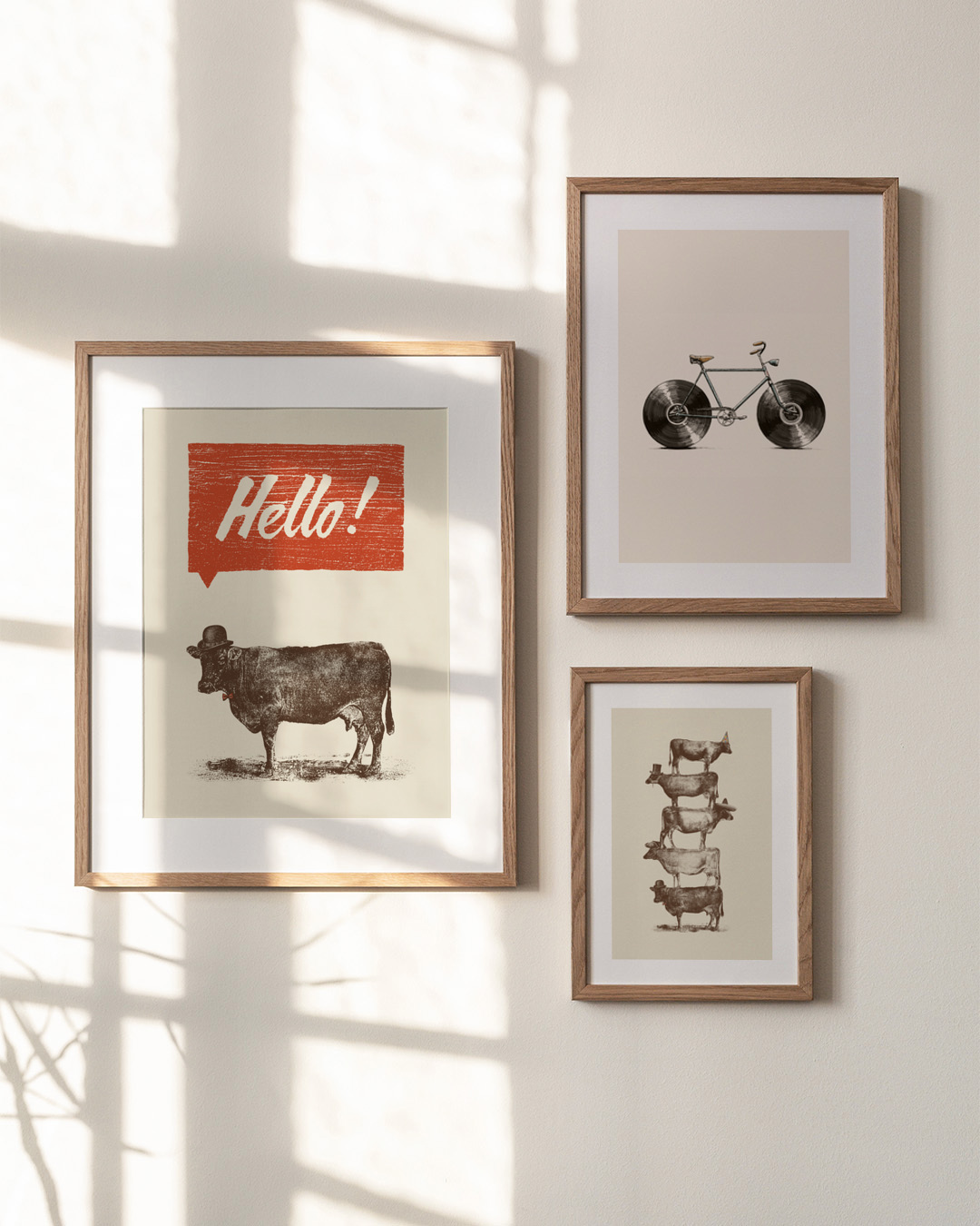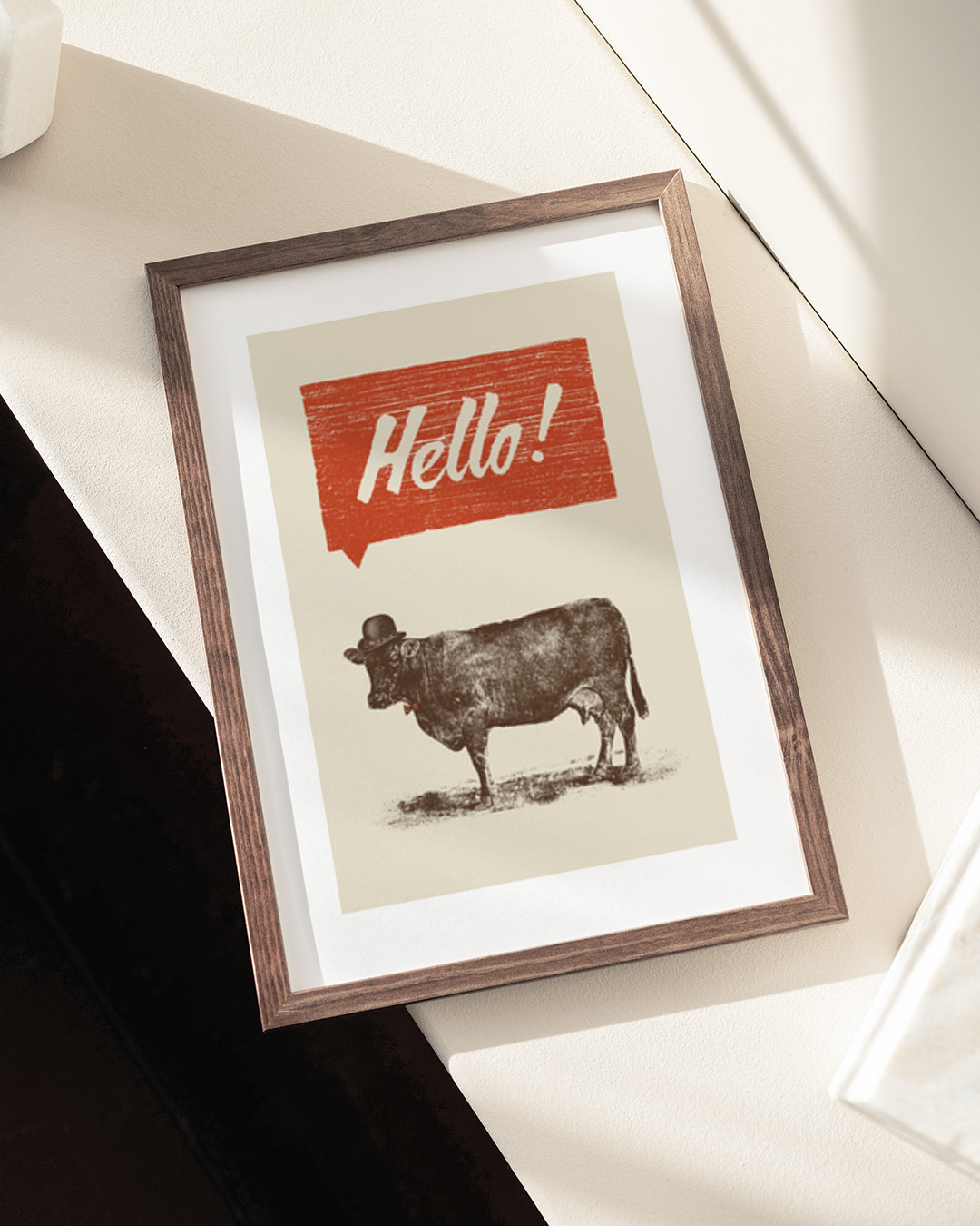 Denne legende tryk af Florent Bodart viser en ko med bowlerhat og butterfly, der hilser dig med et muntert 'Hello!' i en rød taleboble. Det humoristiske design blander humor med vintagecharme, perfekt til ethvert rum.