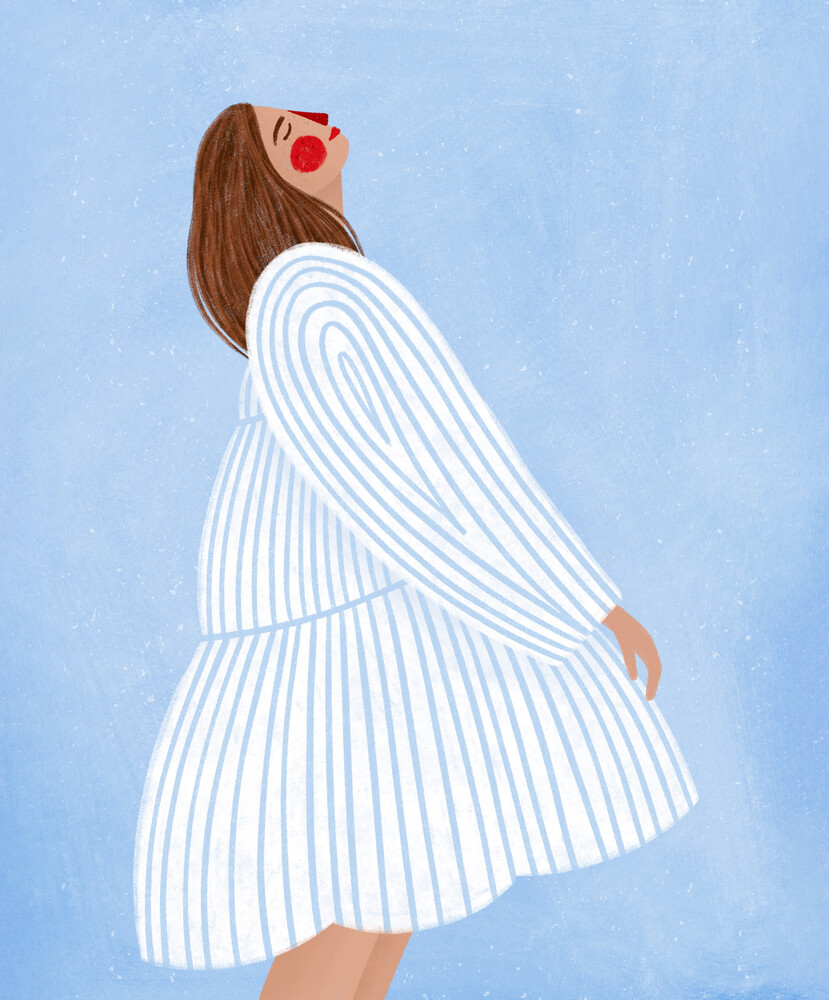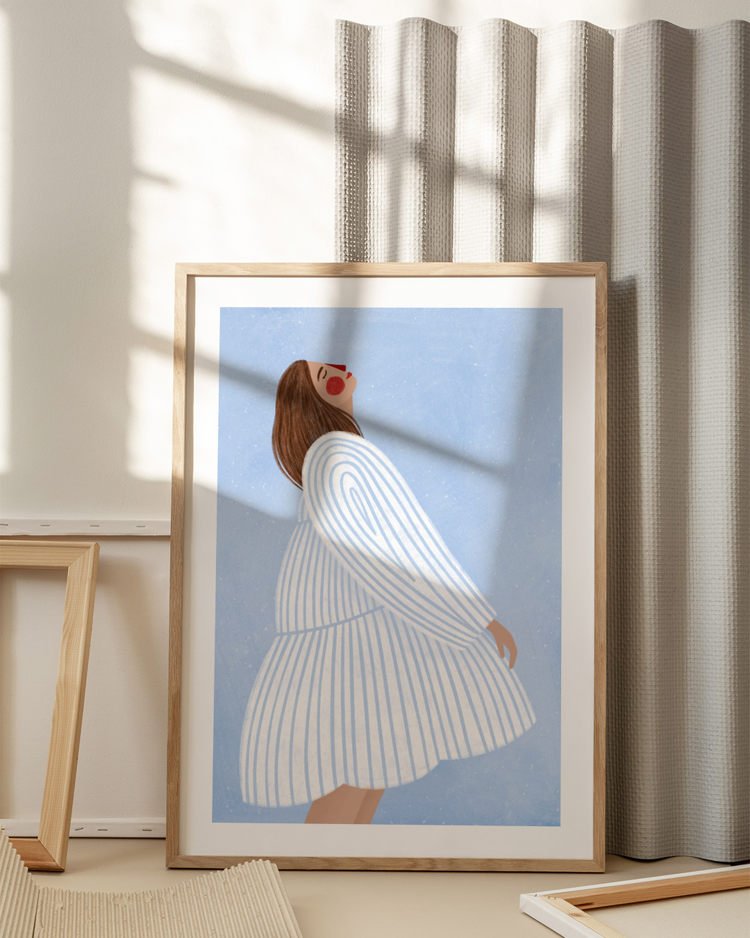 En elegant illustration af Bea Müller med en kvinde med brunt hår i en hvid kjole med blå striber, mod en blød blå baggrund. Et strejf af rød på hendes kind tilføjer et livligt accent til den rolige scene.