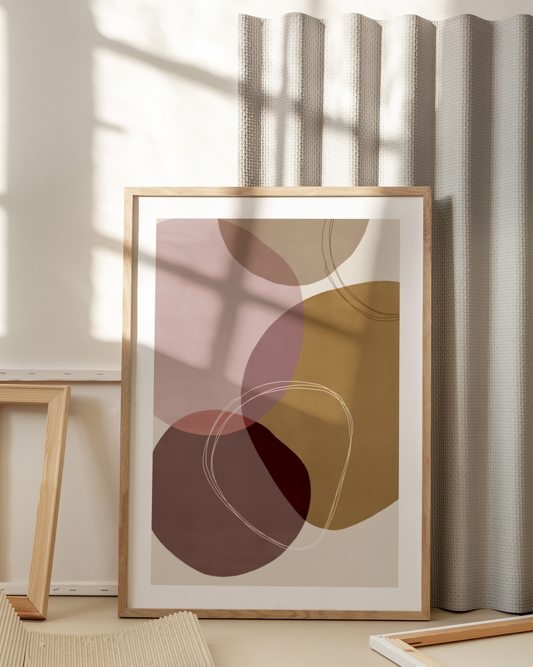 Den opstrakte lærred er indrammet med en elegant svæveramme i ægte træ for et stilrent udseende og ekstra dimension. Afstanden mellem lærredet og rammen skaber en svævende effekt.