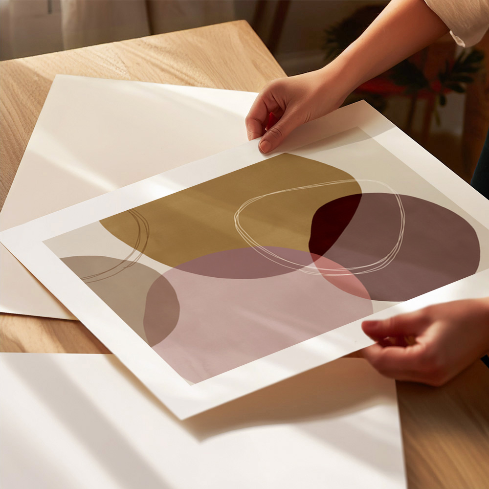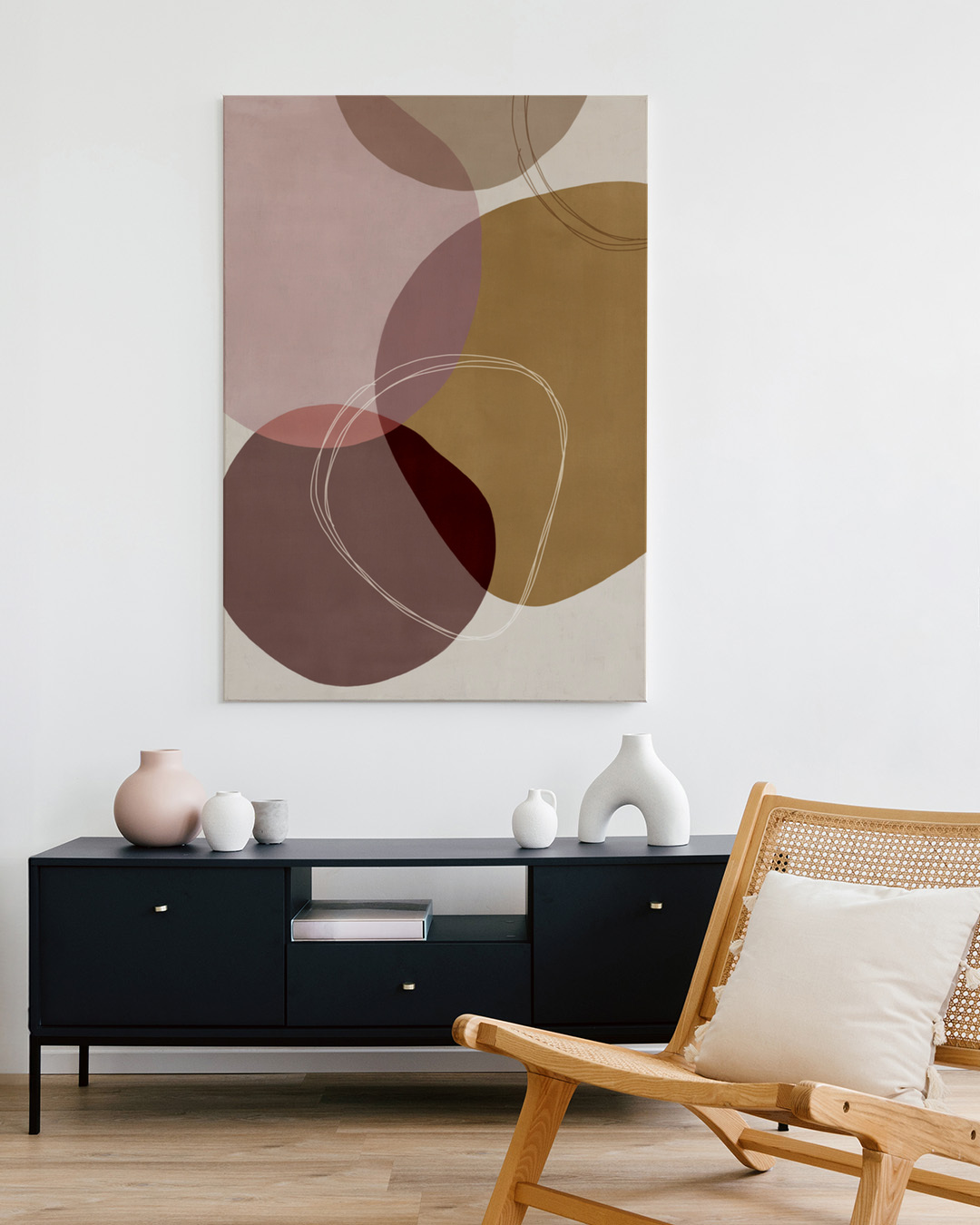 Mareike Böhmers abstrakte design byder på store, overlappende cirkler i subtile nuancer af pink og brunt. Denne harmoniske komposition bruger blide farver til at skabe en rolig og beroligende visuel oplevelse.