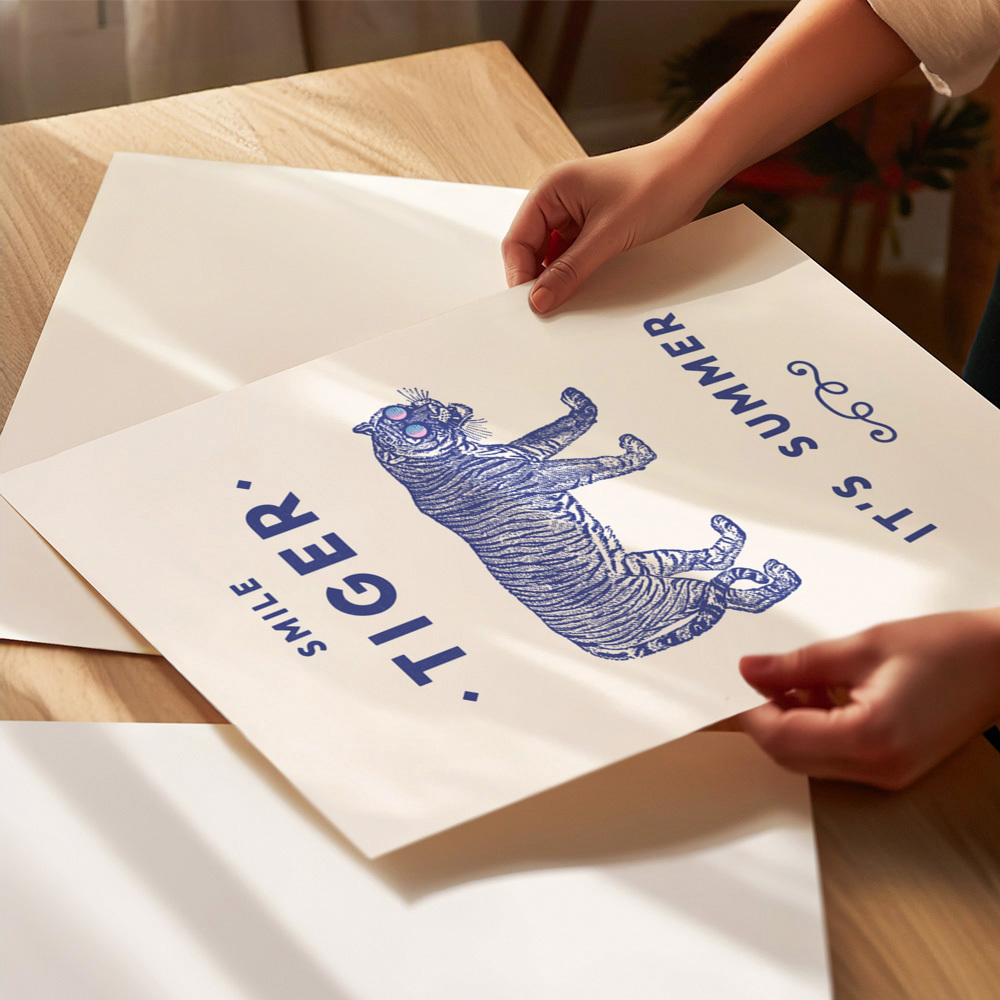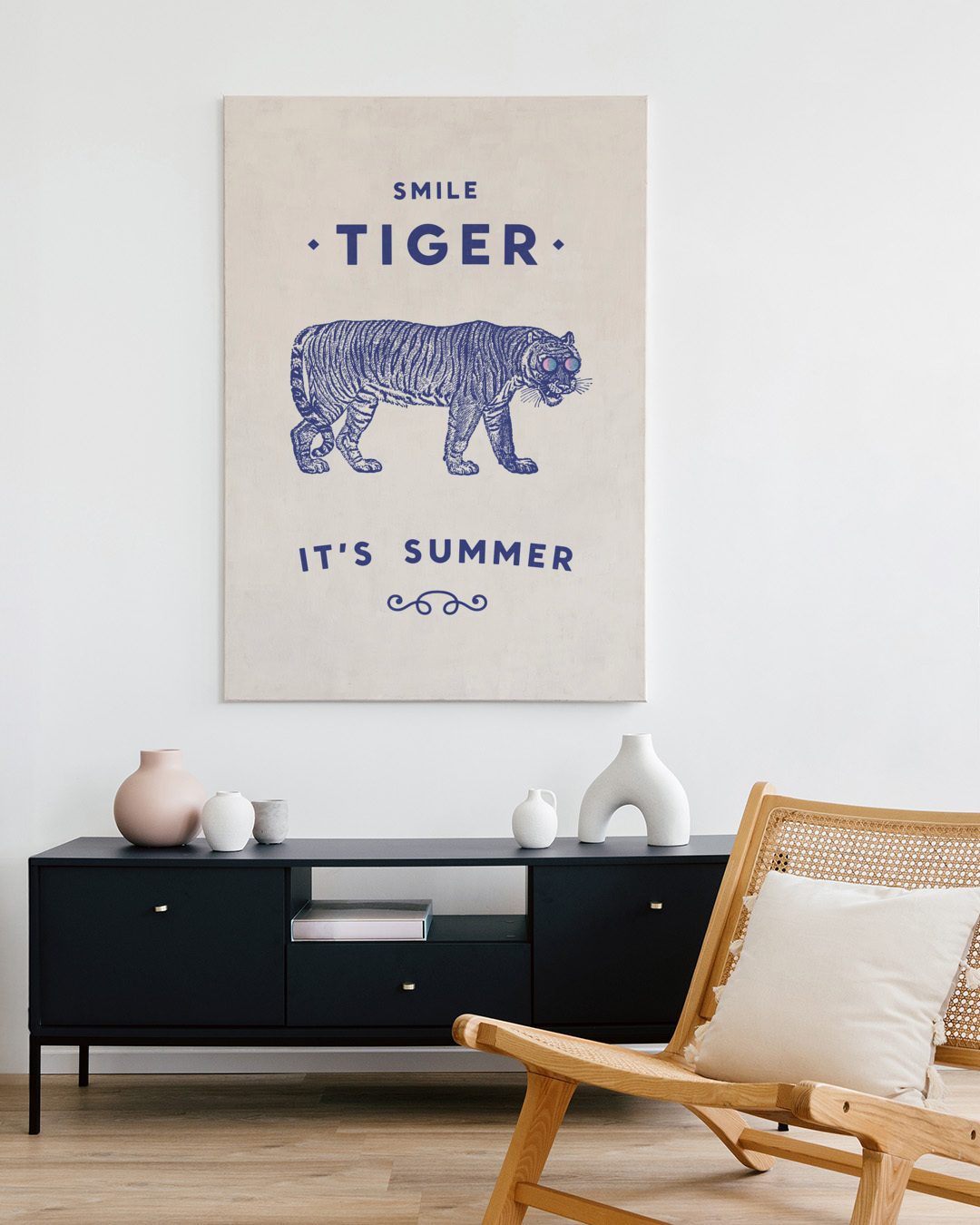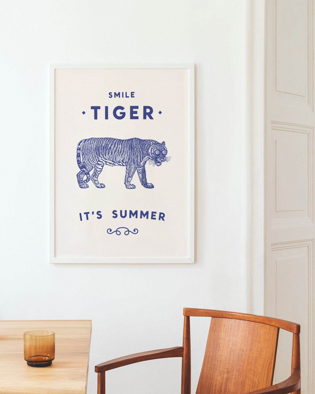 Florent Bodarts kunstværk bringer et humoristisk præg med en detaljeret tigerillustration og teksten 'Smile tiger it's summer.' Den finurlige scene er præsenteret i blå på en blød beige baggrund.