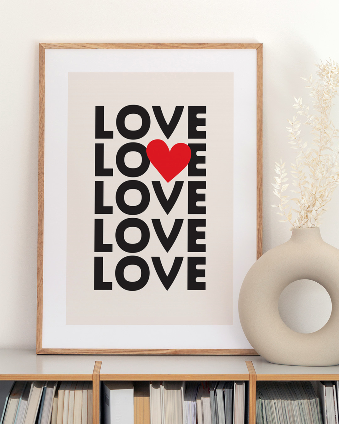 Dette legende tekstdesign viser ordet 'Love' gentaget flere gange med et centralt rødt hjerte, der symboliserer passion og varme. Den fyldige typografi skaber en stærk visuel effekt, perfekt til moderne rum.