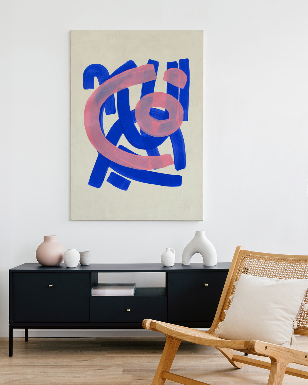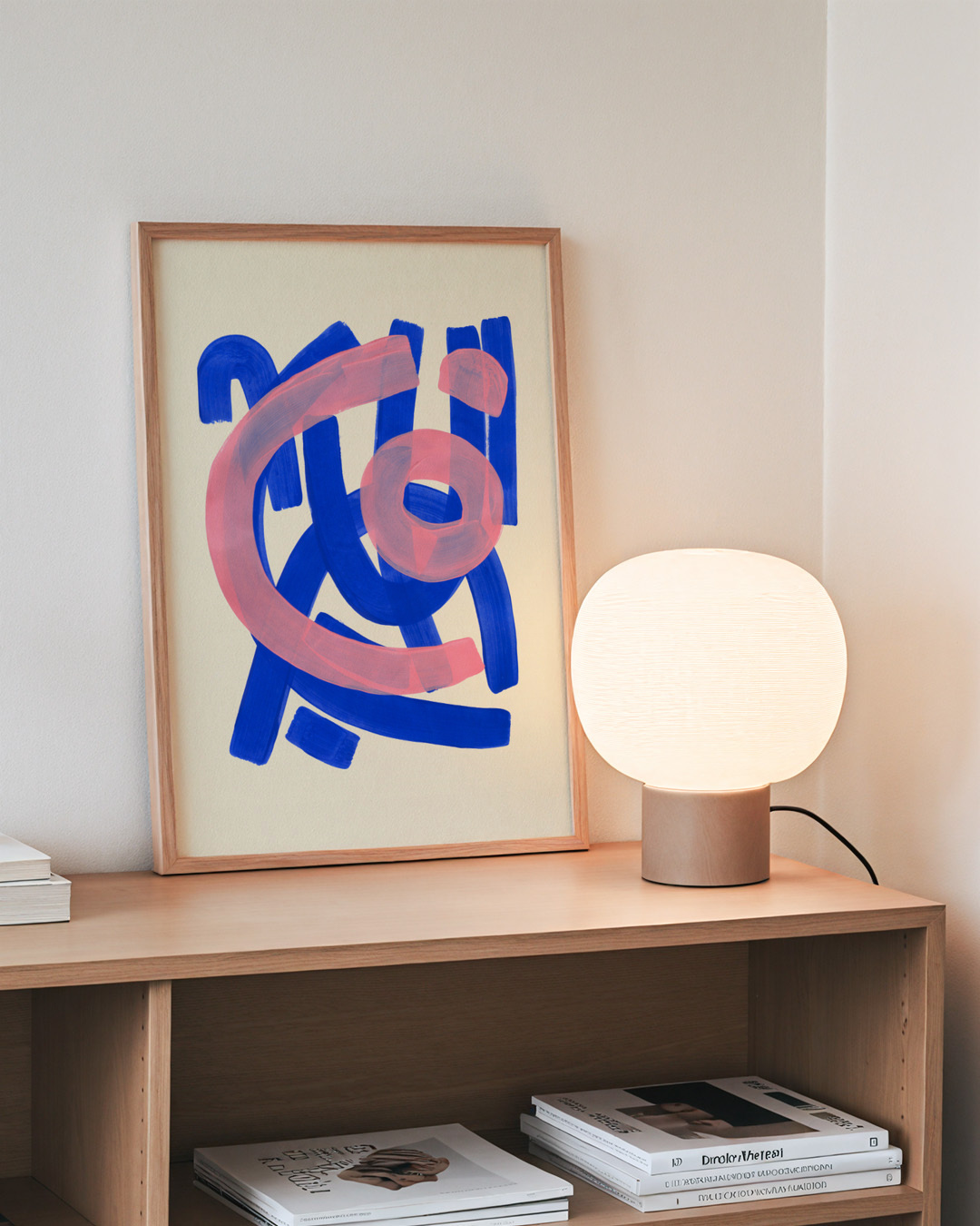 Dyk ind i en verden af livlige abstrakte hvirvler med dynamiske lyserøde og blå penselstrøg. Dette fængslende kunsttryk tilfører et moderne, energisk præg til ethvert rum.