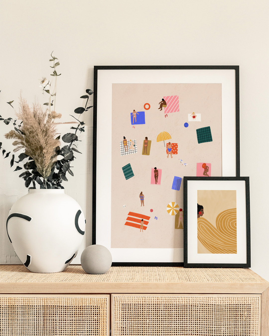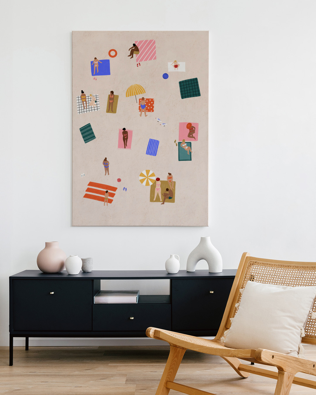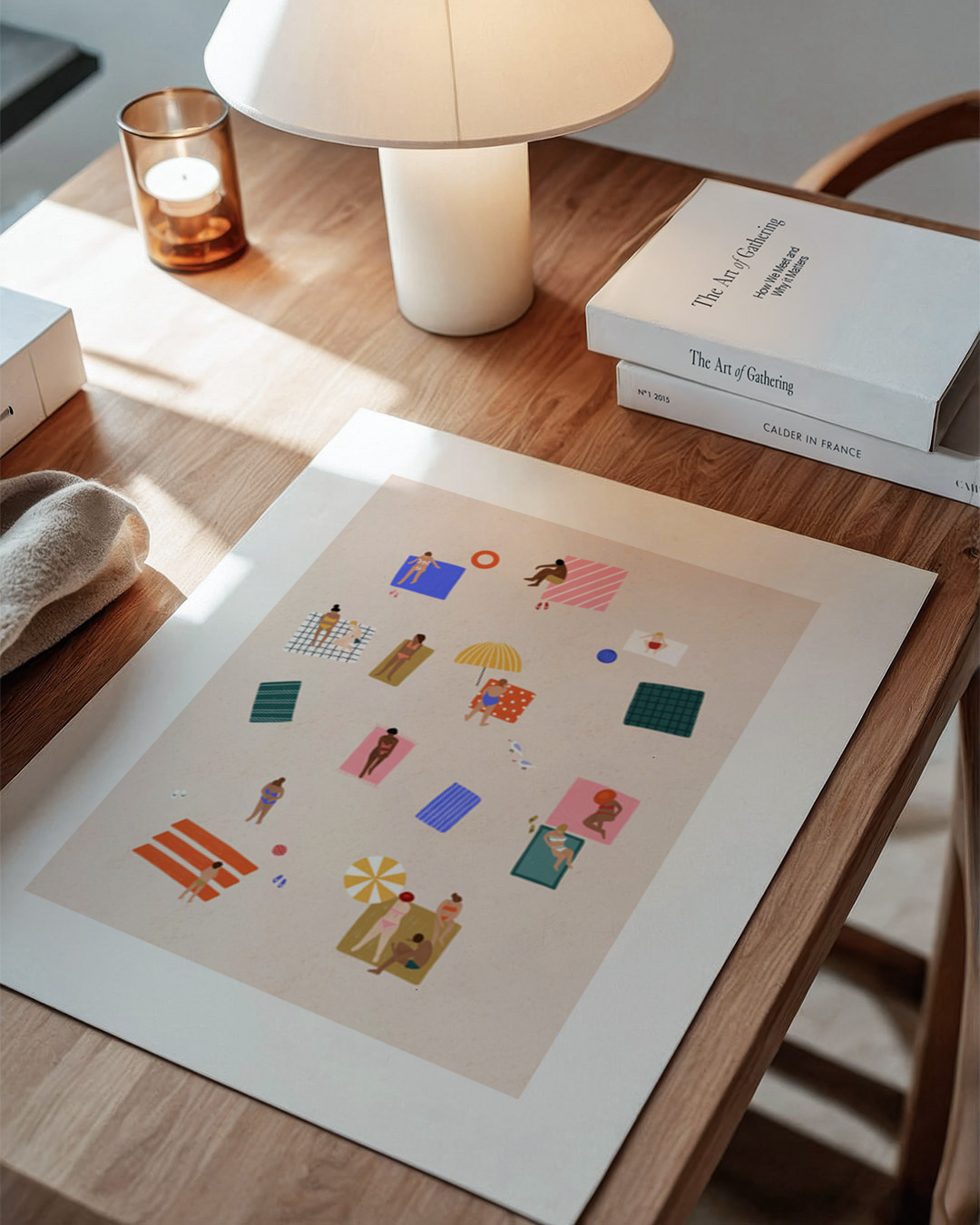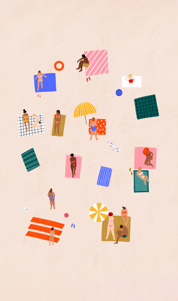Denne charmerende illustration af Bea Müller viser en fredfyldt strandscene, hvor folk nyder solen på farverige håndklæder og liggestole, hvilket fanger en afslappet og rolig sommerstemning.
