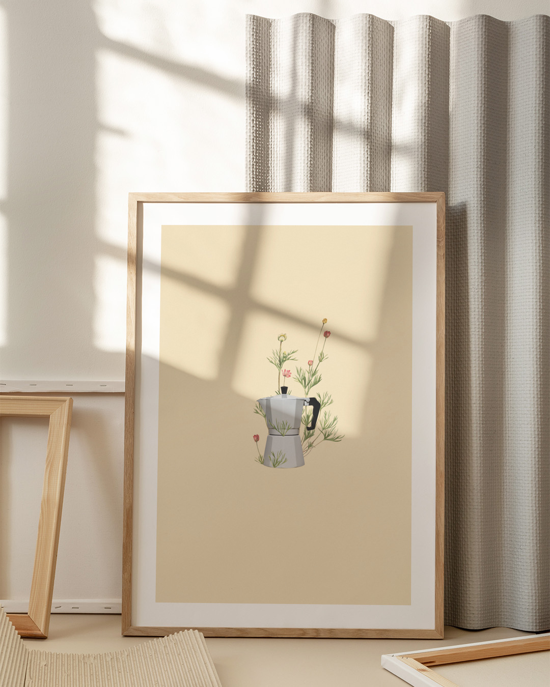 Opdag en smuk blanding af natur og gastronomi med denne illustration af en klassisk moka express prydet med sarte blomster. En perfekt dekoration til kaffefans og blomsterentusiaster.