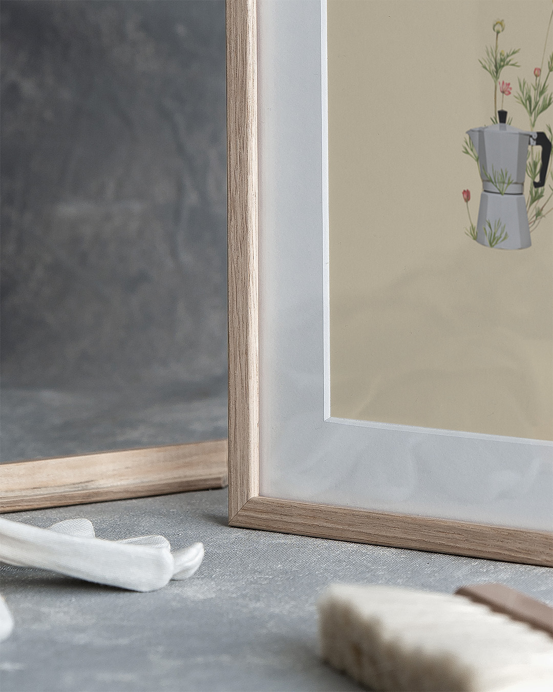 Den ekstra dybe og brede rammeprofil skaber stabilitet og et ægte blikfang på din væg. Håndlavet og afsluttet med et præcisionsskåret
